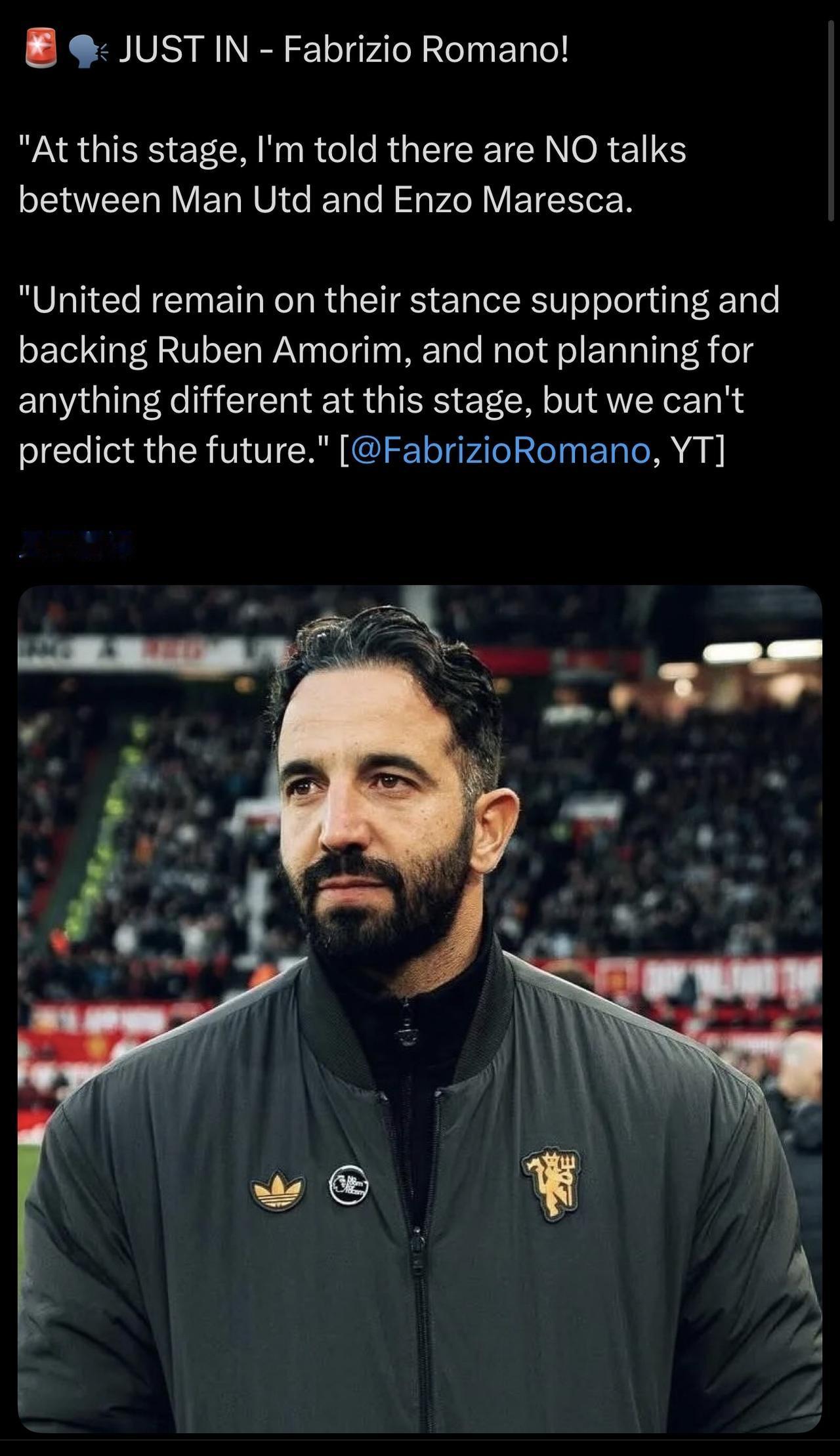 有时候还是老牌子自媒体人靠谱,罗马诺的消息: 🔴“据我所知,目前曼联和恩佐·马雷斯卡之间没有任何谈判。 🔴“曼联仍然坚持支持鲁本·阿莫林的立场,目前没有改变计划,但未来难以预料。”