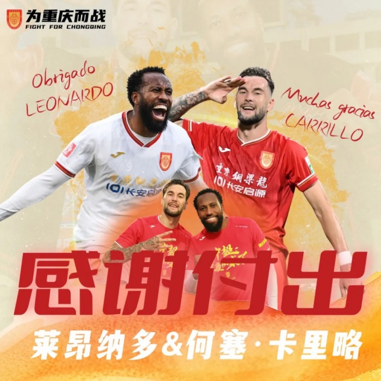 经友好协商,重庆铜梁龙足球俱乐部与巴西前锋莱昂纳多(Leonardo)、西班牙前锋何塞·卡里略(JoséCarrillo)的合同于2025年12月31日到期,双方不再续约。俱乐部谨向两位为球队冲超做出重要贡献的球员,致以最诚挚的感谢与祝福。