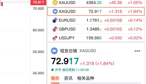 虽然元旦最后一个交易日, 现货白银再度回落。 不过今日是新年的 第一个交易日, 现货白银略微高开, 有所反弹上涨。 现货白银现价72.917美元, 较上一日上涨1.318美金, 涨幅1.84%。 暂时看实现开门红, 继续关注比较好!