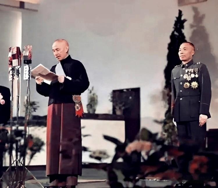 一九四八年,在南京就职仪式上的蒋介石与李宗仁。这不是演员所扮演,确是货真价实的本人,两人外貌呈现得十分清楚,一望而知。