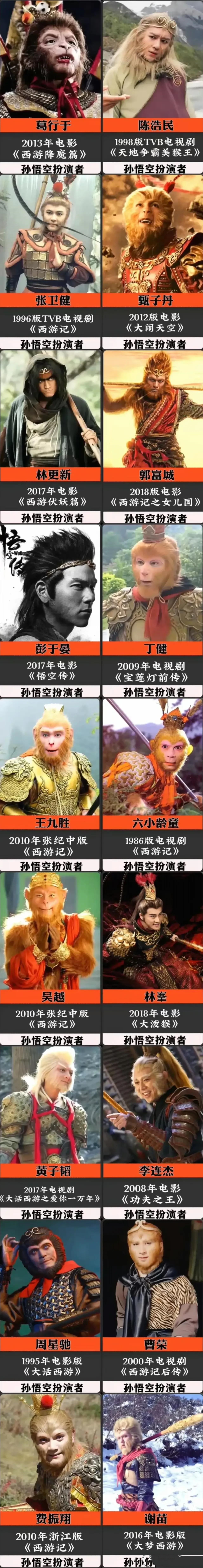 18名曾经演过孙悟空的明星一览图。你最喜欢谁?周星驰、李连杰、六小龄童、彭于晏、张卫健、陈浩民、甄子丹、郭富城……几乎全是一线明星!作为一个80后,小时候喜欢六小龄童的,长大后就喜欢周星驰的,因为他们两人演的“猴子”我都看了无数次。你呢?