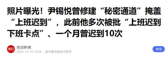 这下完了,尹锡悦的秘密全世界都知道了!韩国总统尹锡悦在任职时,为了不给自己迟到找理由,居然在总统府里修建了一个秘密通道,网曝其内幕,引发全网热议。韩国议员爆料,尹锡悦自2022年上任以来,频繁迟到,尤其是2023年上半年,单月最高记录就达10次,平均每三天就迟到一次,这样的履职纪律放在普通职场都难掩尴尬,更别说身居总统高位。   这起丑闻是韩国共同民主党议员秋美爱12月17日曝光的,她公布了两张照片。照片拍于2022年7月27日到11月23日之间,清晰记录了首尔龙山总统府综合大楼东入口的施工场景,这里就是尹锡悦秘密通道的修建现场。   据韩媒披露,这个工程是韩国现代建设公司承建的,可不是简单补补修修。施工队拆了总统办公室大楼的外部楼梯,动用重型机械挖掘场地,专门装了这条隐蔽通道,全程都刻意低调。目的就是让尹锡悦出入时不被外界发现,好掩盖他频繁迟到的真相。   其实早在2025年9月,就有证词说韩国总统警卫处和总统办公室修这条通道,核心就是为了掩盖尹锡悦上班迟到。现在照片一曝光,彻底坐实了这个说法。   一位熟悉建设情况的知情人透露,当时总统警卫处的领导层特意要求总统行政办公室,修一条能让尹锡悦迟到时悄悄进入的通道。   而且警卫处内部的证词也明确证实,尹锡悦确实多次走这条秘密通道上班,想躲开外界的视线。更让人在意的是,这个秘密工程不是白修的,花了4亿韩元,钱还是从韩国国防部预算里拨的。相当于用纳税人的钱,给尹锡悦的迟到行为打掩护,这种操作让民众特别愤怒。   尹锡悦迟到早就不是新鲜事了。他2022年5月就任韩国第20届总统后,就因为总迟到被在野党追着批评。有韩国议员公开说,接到举报称尹锡悦单月迟到最多能到10次,平均每三天就迟到一次。   这种履职纪律,就算是普通职场都让人看不过去,更别说他是一国总统,要扛着治理国家的重任。早在2022年5月,韩国最大在野党共同民主党的紧急对策委员会共同委员长尹昊重,就公开批评过他上班迟到,而且越来越晚。   尹昊重还举了例子,说11日星期三尹总统8点30分上班,12日就9点10分,13日更是到了9点55分,调侃他再这么推迟,最后说不定要变成居家办公了。更让人诟病的是,就算朝鲜发射导弹这种敏感时刻,尹锡悦还是下午6点准时下班,完全不管突发局势的应对需求。   面对迟到的指责,韩国总统办公室还专门召开发布会反驳,说“总统没有上下班的概念”,想靠这话淡化争议。可现在秘密通道一曝光,直接戳穿了这套说辞,尹锡悦这下更尴尬了。   除了日常办公迟到,他的迟到还引发过外交风波。2022年9月,尹锡悦去英国参加英国女王伊丽莎白二世的葬礼,原本计划葬礼前一天瞻仰女王灵柩、签署吊唁簿,结果因为自己迟到,行程直接被取消,最后只勉强参加了英国国王查尔斯三世主办的招待会。   当时韩国总统办公室把责任推给伦敦的交通,但韩国民众和媒体都不买账。大家质疑尹锡悦明明知道伦敦会因为葬礼陷入交通混乱,却没提前规划行程、提早抵达,本质就是履职态度不严谨,这场“吊唁外交”最后也成了外界的笑柄。   秘密通道丑闻曝光后,韩国全网都炸了。民众在社交平台上纷纷吐槽,有人说“作为总统连基本的守时都做不到,还偷偷修通道掩盖,简直是亵渎公职”,还有人质疑“4亿韩元的国防预算就这么被挪用,到底还有多少不为人知的秘密”。   在野党更是抓住这个机会猛烈攻击,共同民主党不光指责尹锡悦履职散漫,还把这事和他过往的执政乱象绑在一起,说他“从上班迟到到滥用预算,从来没有过总统该有的责任感”。   其实尹锡悦的执政生涯一直充满争议,他任职期间,所在的国民力量党在国会始终是少数党,面临“朝小野大”的不利局面。他的内政外交政策屡屡不得民心,经济上也没扭转韩国增速放缓、房价上涨的困境。   就连“第一夫人”金建希也多次陷入争议,成了在野党攻击他的突破口。 更严重的是,尹锡悦还因为突发的“紧急戒严”事件,引发了韩国宪政危机。   2024年12月3日,他突然通过电视直播宣布实施紧急戒严,说要肃清“反国家势力”。这个举动直接引发韩国政坛震荡,国会第二天就通过决议解除了戒严令。之后,调查机关以涉“紧急戒严”核心人员的身份,对尹锡悦立案调查,还禁止他出国。   国会也通过了要求逮捕他的决议案,最后他成了韩国宪政史上首位任内被逮捕、被拘留调查并被起诉的总统。   2025年4月,韩国宪法法院通过弹劾案,尹锡悦被罢免总统职务,结束了混乱的执政生涯。而这次秘密通道和迟到丑闻的曝光,更像是压垮他公众形象的最后一根稻草,让本就低迷的支持率彻底跌到谷底。   他的支持率最低时只有13%,负面评价飙升到80%,创下了韩国总统执政以来的最差纪录。