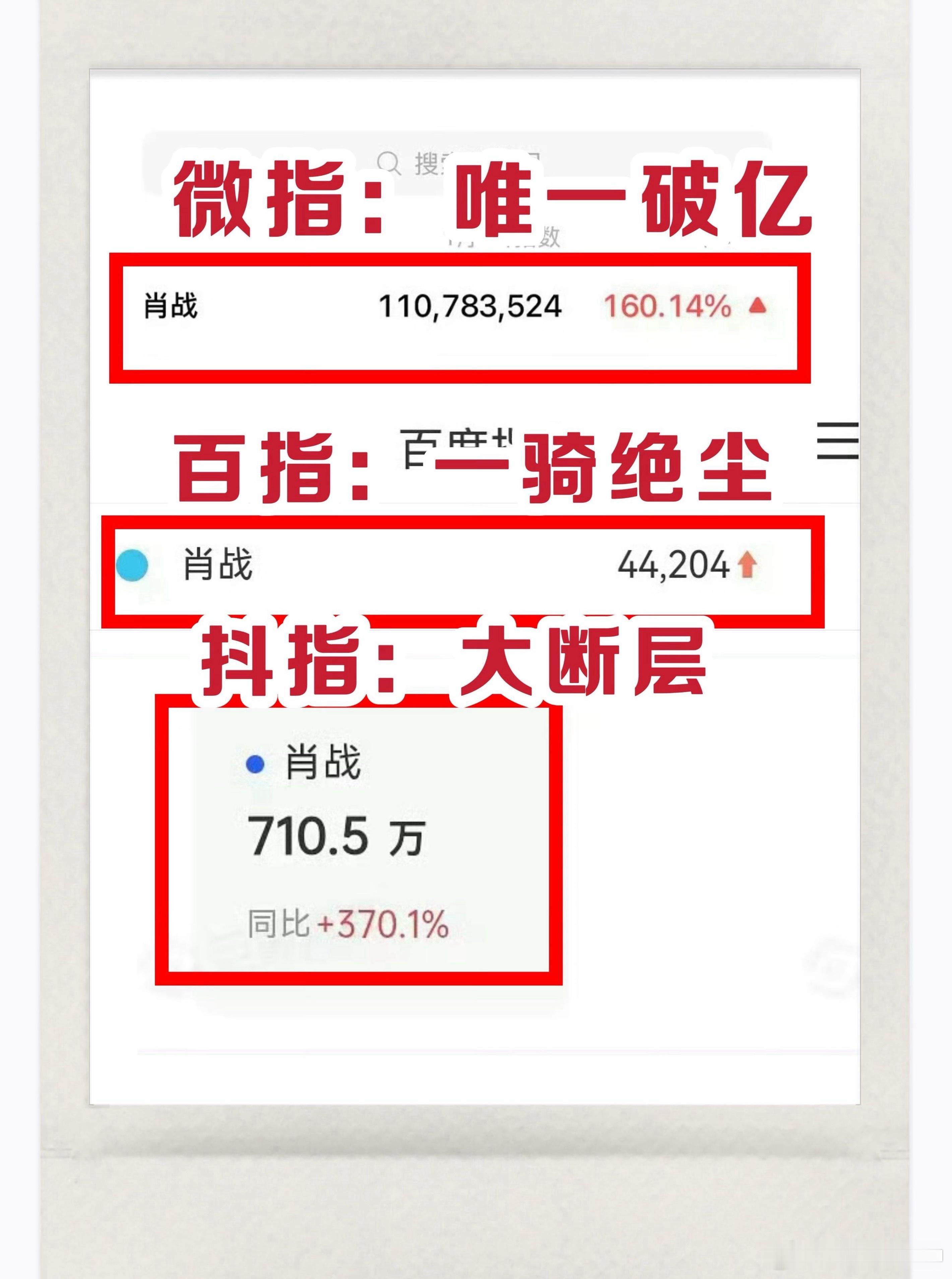 肖战微指第一肖战工作室背景是红海肖战 内娱唯一拥有顶级流量➕顶级国民度的巨星跨年晚会所有明星中:1️⃣微指:肖战唯一破亿1.1亿➕2️⃣抖指🫘:肖战~710万大断层🔥3️⃣百指:破4.4万👏一骑绝尘4️⃣肖战本人微博互动人数90多万非常牛掰5️⃣肖战提升东方卫视跨晚收视率排名上升至全卫视第二🔝cvb逆势提升25%热度指数全卫视跨晚第一☝️(国民度、路人盘、大众层面的关注度讨论度、核心粉丝粘度统统碾压 巨星肖战统统大断层✌️)肖战一步一步一部一部王彦霖回复肖战肖战跨年收视破1