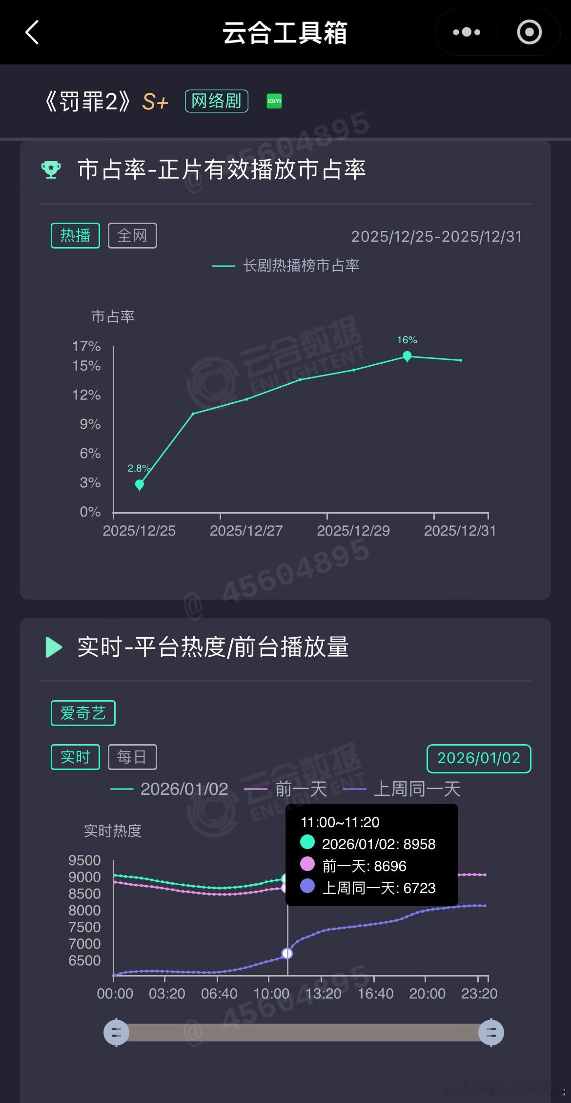 到底是谁把罚罪2 奶到集均4500万的???当前集数过半,播放量云合最高3500万,酷云最高3700万……40集双更的剧单日峰值播放量没到8000万都到不了4500万的,这还是在爱奇艺热播期超长的前提下~元旦当日罚罪爱奇艺热度9087,跨年+元旦二连降了。好消息是实时热度已经比昨日高200,今晚热度9200-9300上下目前的走势感觉就是集均2000-2500万,如果播放量能上去,再提高预估的集均