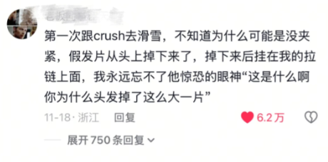 第一次跟crush去滑雪,不知道为什么可能是没夹紧,假发片从头上掉下来了,掉下来后挂在我的拉链上面,我永远忘不了他惊恐的眼神"这是什么啊,你为什么头发掉了这么大一片"