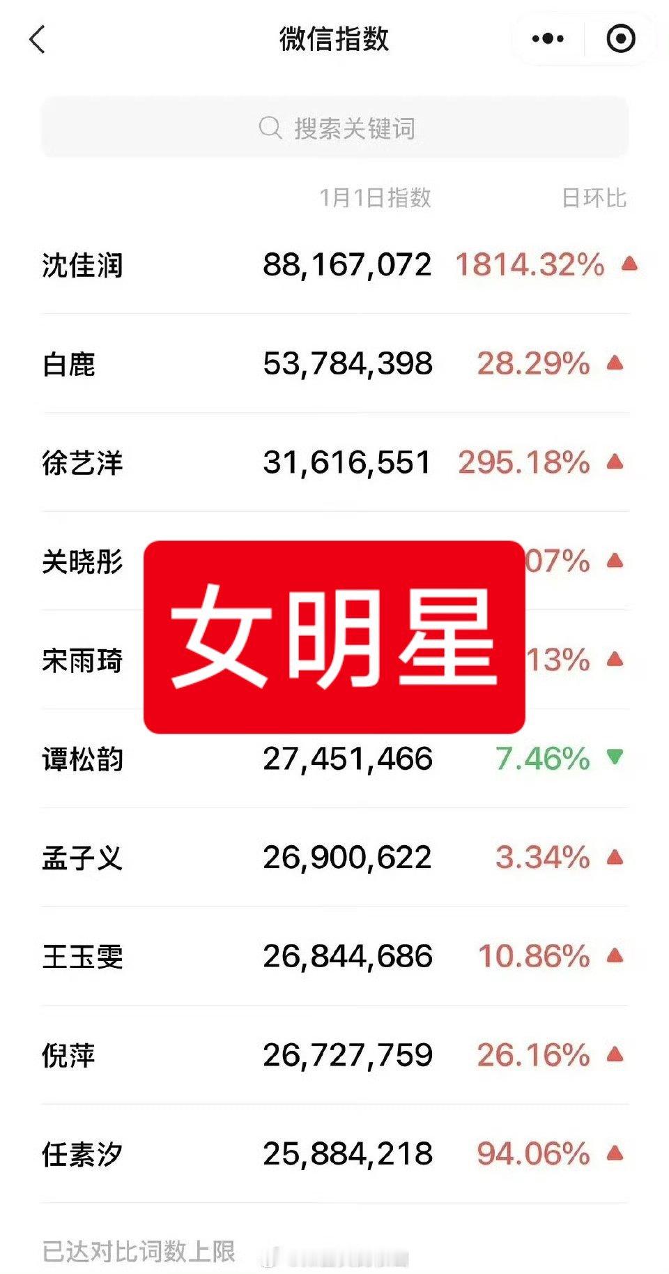 湖南卫视跨年标杆 2026年跨年晚会微指热度排行榜——❶女明星第一,沈佳润,被嘲跑调爆了词条。❷男明星第一,肖战,是什么出圈啊?没太关注?