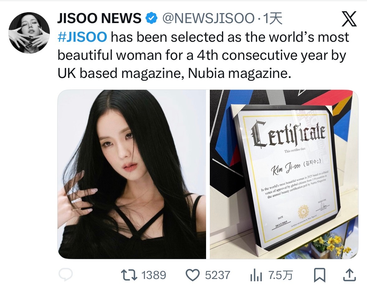 金智秀连续四年被英国杂志《努比亚》评选为世界上最美丽的女人。