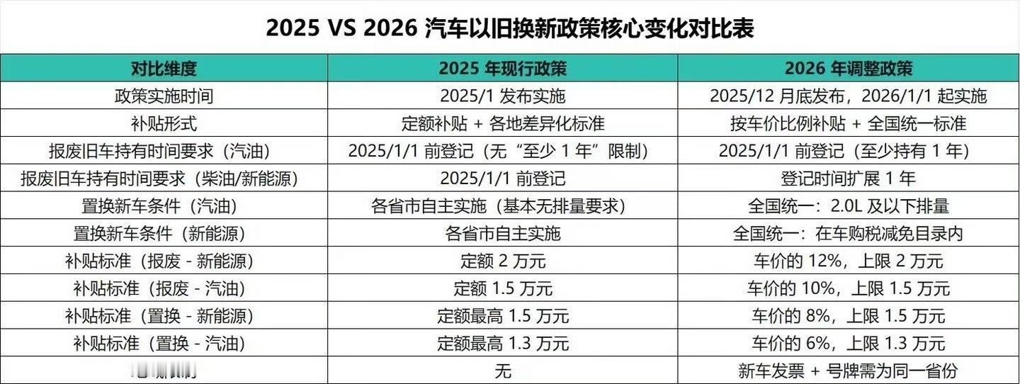 2026国补怎么补 2025年与2026年汽车以旧换新政策核心变化对比表。一看就懂,车价越便宜,补贴就越少。但是你不要着急啊,销量下滑,下半年肯定还要用优惠找补回来,2026年一定是等等党的胜利。