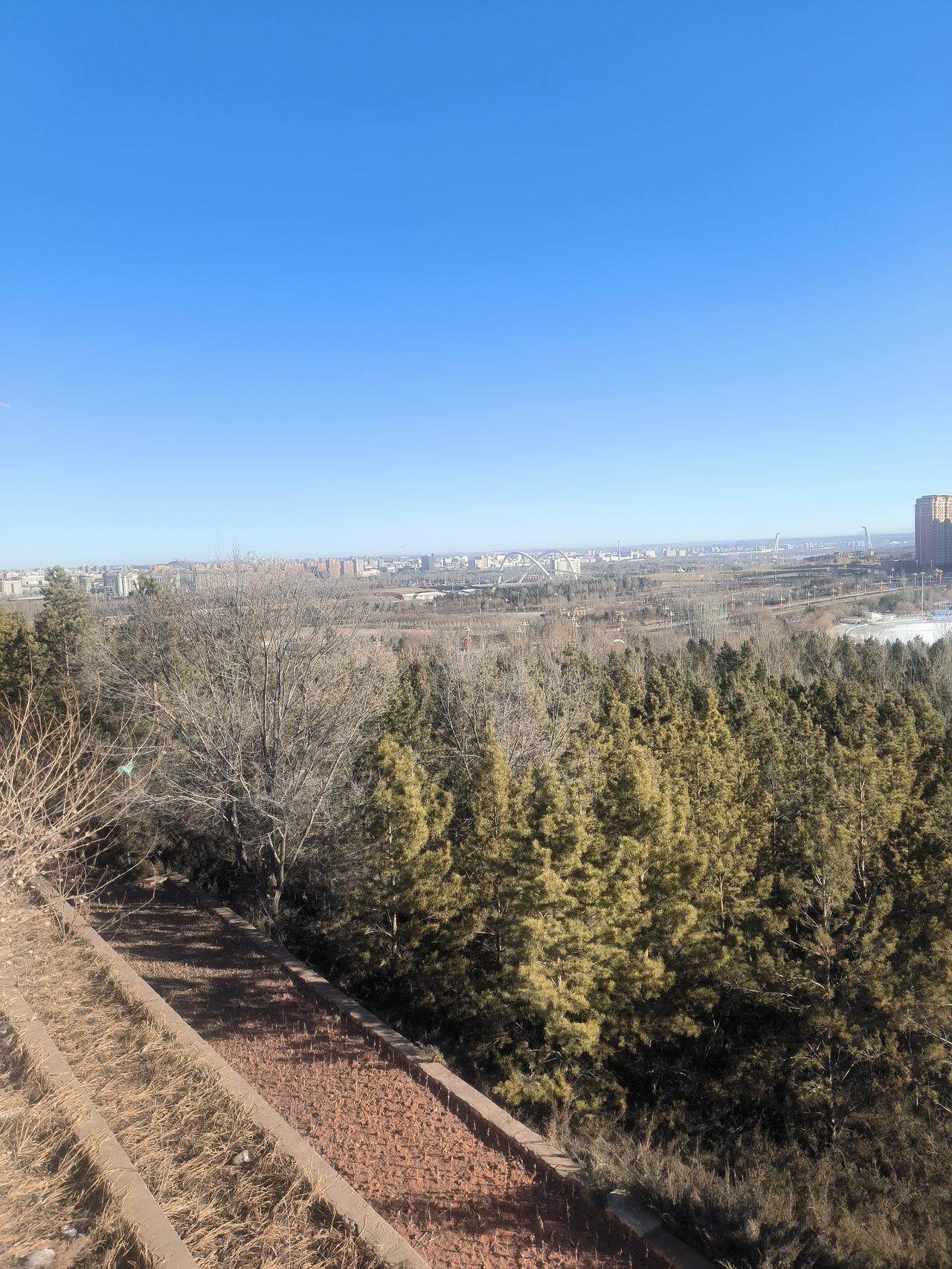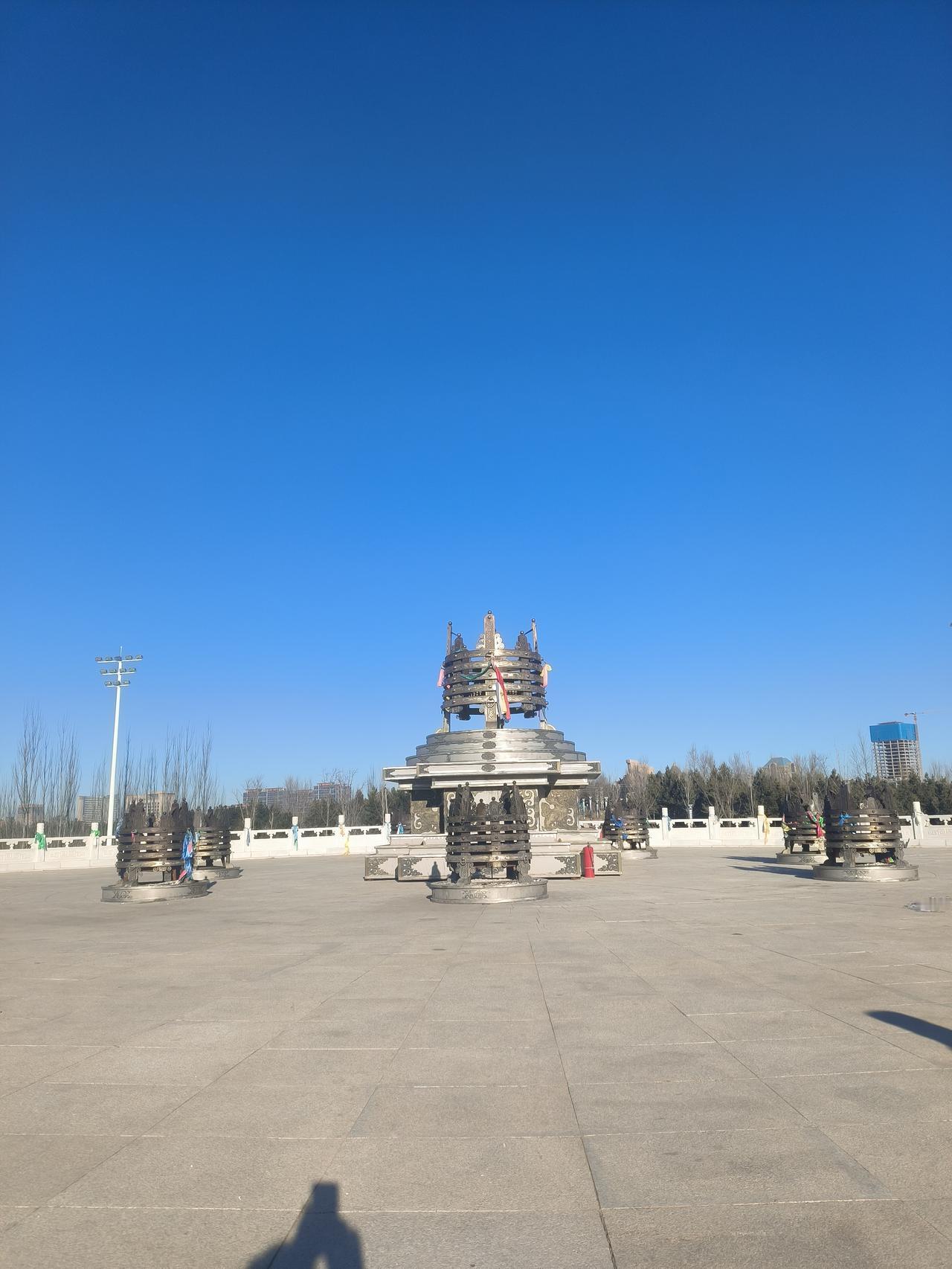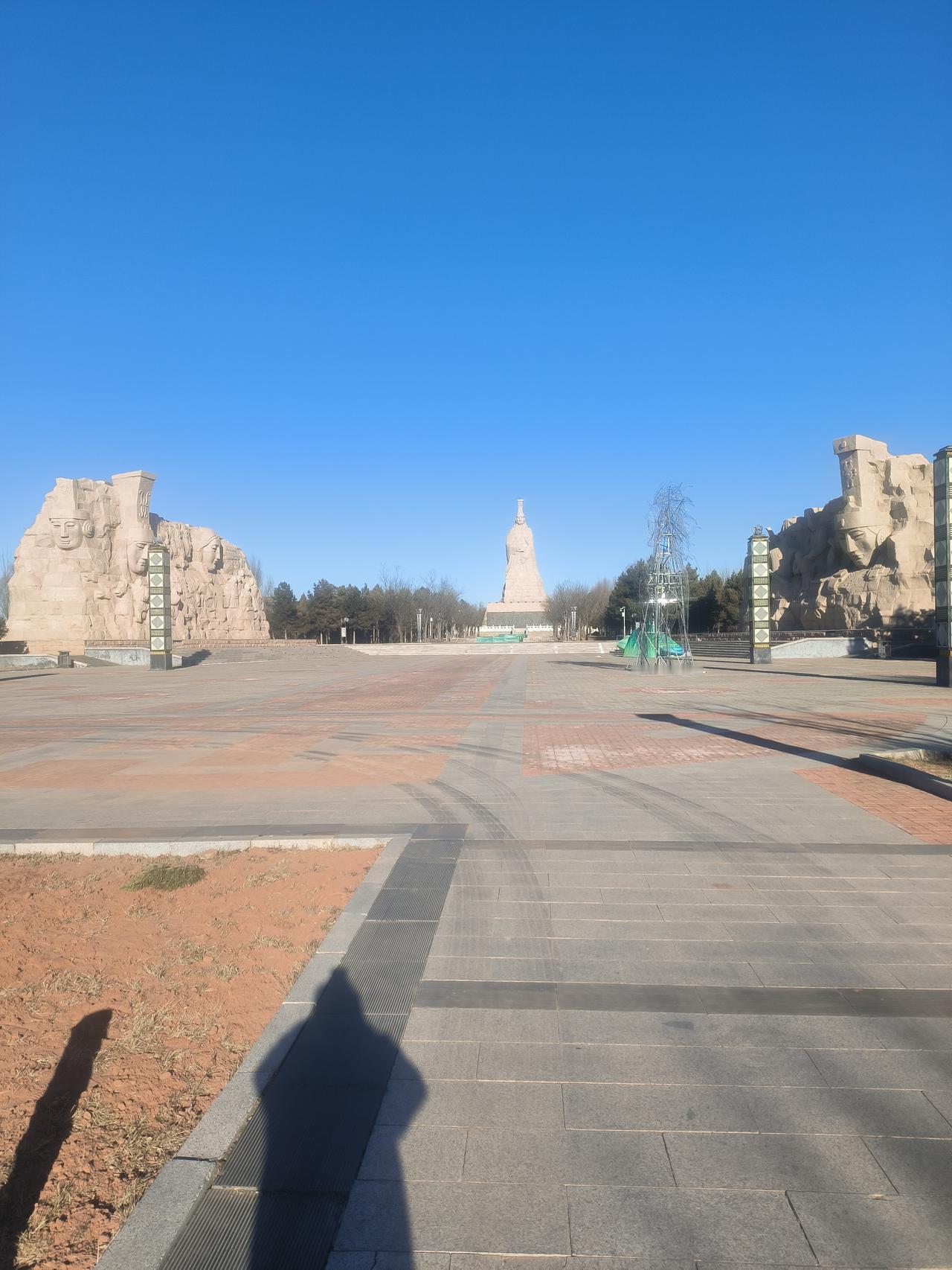 虽然近在咫尺,但是却三年没进母亲公园。不是工作有多么忙,而是接送孩子念书实在没时间。今日放假,天气也晴朗,决定进母亲公园看看。母亲公园在我家的后山上,依山傍水而建,是个森林公园,公园因有成吉思汗母亲诃鄂伦雕像也得名。沿着石级而上,首先看到的是祭火台,一个圆形的建筑上有一个大的,七个小的祭火盆,代表了伊克昭盟及七旗王公。每年阴历十二月二十三日,是蒙古族的祭火节,要举行盛大的祭火活动。当然十二月二十三日也是蒙古族的大年,我们这里非常隆重,蒙古族的年夜饭除了手扒肉,必不可少的是一种用羊肉丶奶酪丶红枣丶酸奶做成的焖饭,非常好吃,每年我们都要自己动手做。走过祭火台,中轴线上就远远看到三组雕像,正中就是母亲雕像,是成吉思汗母亲雕像,高高矗立在山顶,面部和蔼慈祥。走过母亲雕像,穿过五十多米走廊,便到了山顶,上面一字排着十三个石头堆成的敖包,十二个小的,一个大的。放眼四望,绿城伊金霍洛阿腾席热镇尽收眼底,远处能看到三号桥丶四号桥飞架在乌兰木伦河上,河那边便是康巴什区,一个以城市命名的4A级景区。此时,近处的母亲公园湖,远处的红海子,都被冰雪覆盖,见不到水,却看到滑冰的人。冬天的母亲公园并不宁静,远处近处都有人工作。今年伊旗政府将正月正的花灯节定在了母亲公园,工人们正在沿路施公,搭建灯游各种装饰,五颜六色,各种花灯造型,有的初具雏形。远处的山,近处的景,一座绿色城市,也是最适宜人居城市,却因忙忙碌碌而无法品味其中的魅力,不能说令人非常遗憾。沿着石级而下,回头看看母亲公园,不由让我们感慨,就像生活中一样,母亲是孤独的,而我们却渐行渐远,无法细细品味这温暖的生活。2026年,愿我们停下忙碌的脚步,更多享受人间的温暖。