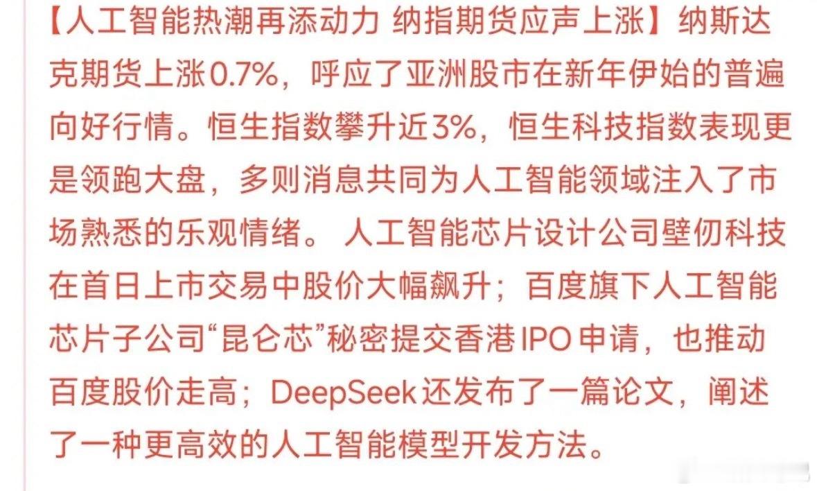 AI概念又火出圈!恒生科技指数今天涨超3.7%,DeepSeek新发布的高效开发方法成了催化剂。这赛道2025年就热度拉满,2026年更是一点利好就带动上涨,现在算力相关企业还是涨势主力。不过随着算力布局逐渐到位,2026年行情大概率会从技术开发端,往AI营销、办公这些实际应用端延伸啦。
