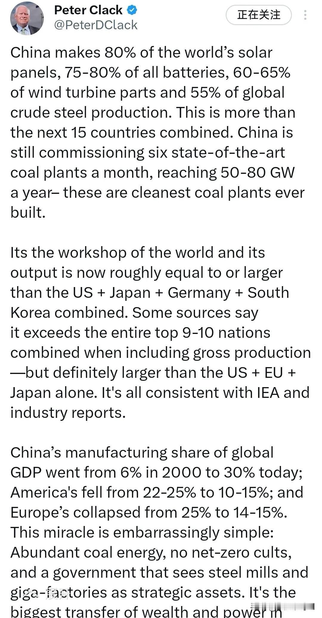 澳科学家发文盛赞中国制造业,西方网友炸锅 澳科学家皮特·克拉克1月1日发文夸中国制造业,帖子在全球疯传。 克拉克列出实打实数据,中国太阳能电池板占全球80%产量,电池占75-80%,风力涡轮机部件占60-65%,粗钢占55%,都超过紧随其后15国总和。每月还在投产6座最先进燃煤电厂,年产能50-80吉瓦。中国制造业产出堪比美日德韩总和,占全球GDP比重从2000年6%涨到30%,而美国欧洲占比纷纷下滑。 最新消息显示,工信部2025年底确认,中国制造业占全球比重约30%,连续15年全球第一。网友争议挺热闹,有人说这数据硬核到不敢信,有人吐槽西方就是酸了,还有人说中国是真靠谱。这事儿根源很简单,中国不搞“净零崇拜”,把工厂当战略资产,加上完整产业链,就像全球产业的顶梁柱,稳稳托住产能。 西方不少国家光喊口号不实干,中国却闷头搞生产,这场权力转移没动一枪一炮。这事让全球看清制造业实力才是硬道理,也让西方不得不重新审视中国。 你觉得中国制造业的优势还能保持多久?评论区聊聊。
