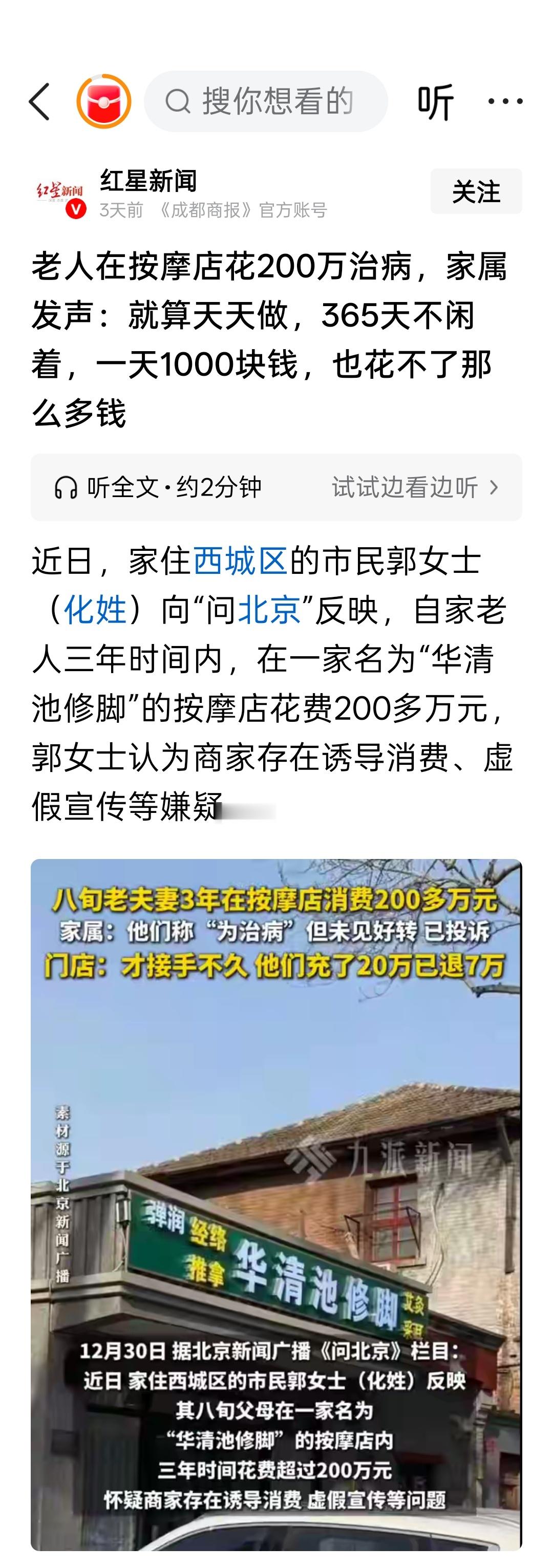 老人在按摩店花200万治病,家属发声:就算天天做,365天不闲着,一天1000块钱,也花不了那么多钱