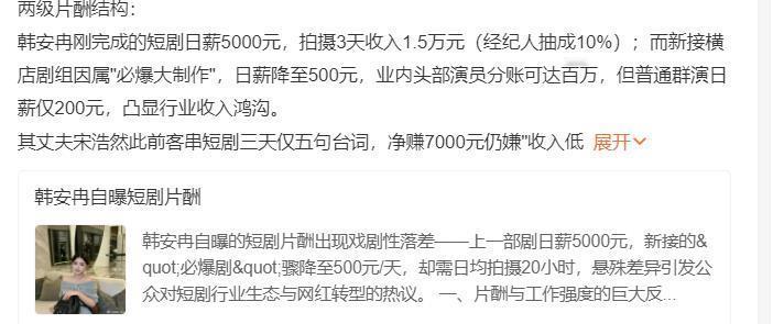 短剧待遇到底怎么样,韩安冉应该说的是实话…… 最近以来,短剧的火爆似乎无需多言,只要耍短视频,基本就没不知道的, 那么,剧情节奏那么快的短剧,他们的片酬,或者他们行内收入到底怎么样, 一直以来都是行业秘密,或者说不如传统娱乐圈那么透明, 没想到韩安冉居然去参演了短剧,这不就透明了嘛, 毕竟她知道了,几乎等于圈里都知道了不是 她自己爆料,拍了一部短剧,三天一共的了15000,差不多就是5000元的日片酬, 她虽然不是主流短片女主,不过价格应该大差不多, 那么说那就是5000-20000左右,这比之208,简直不要便宜到多少, 不过顶级大咖应该不会,多应该也是分成之类的 毕竟较风险共摊和利益共享才是最好的合作嘛