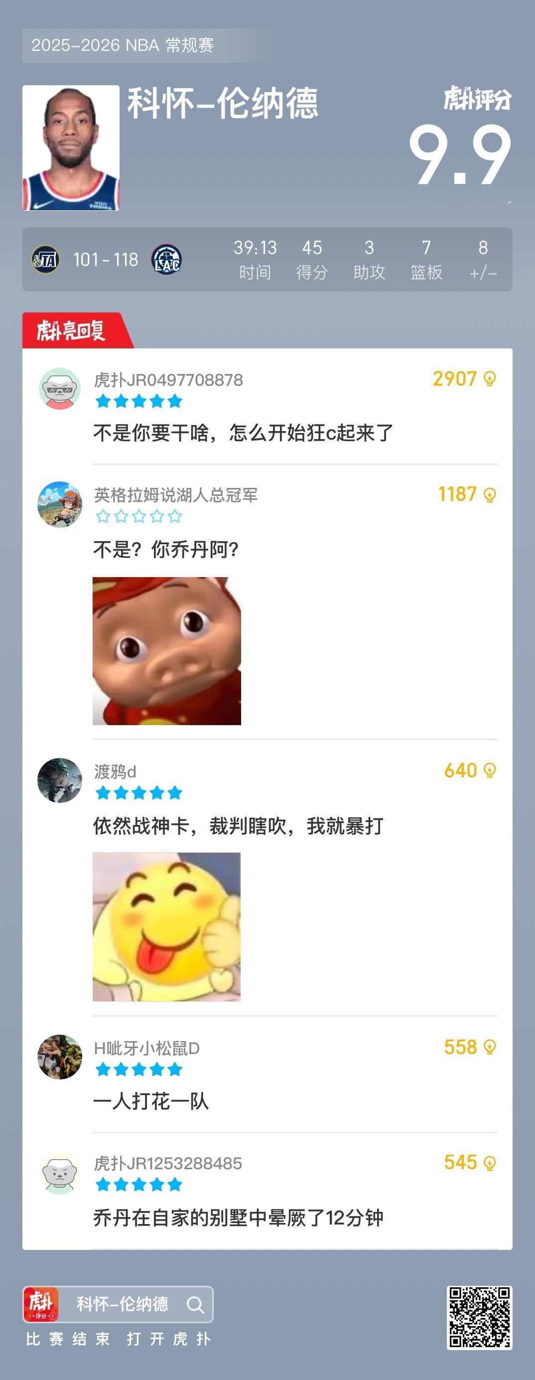 六连胜!伦纳德本场砍下45分7板3助,过去五场场均砍下40分NBA常规赛,快船118-101战胜爵士。本场比赛,快船队球员科怀-伦纳德出场39分钟,投篮29中16,三分球16中6,罚球9中7,得到45分7篮板3助攻2抢断2盖帽。据统计,科怀-伦纳德过去五场比赛场均砍下40分。本场比赛取胜后,快船豪取六连胜,目前战绩12胜21负暂列西部第十一。快船六连胜伦纳德45分爵士vs快船