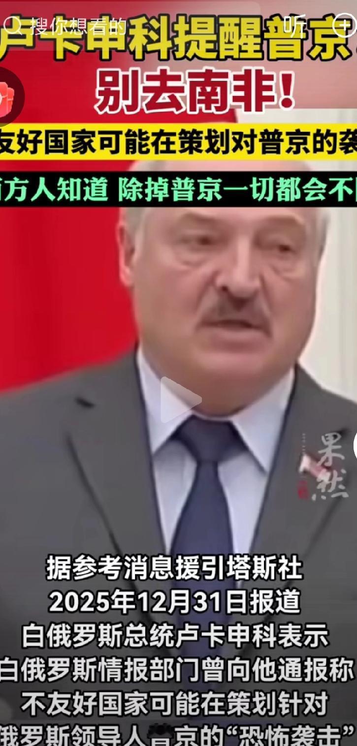 12月31日,白俄罗斯总统卢卡申科向记者透露,是他建议俄罗斯总统普京不要前往南非参加G20峰会的,还详细说明了他通过西方渠道得知的针对普京的“斩首”行动。鉴于此,卢卡申科向普京分析其当下的周边环境,极力劝他不要出席在南非举办的G20峰会。 不难看出,卢卡申科真心是为普京着想,更是为了白俄罗斯考虑。他明白,一旦普京遭遇不测,白俄罗斯也将陷入危境。(个人观点,不喜勿喷,谢谢!)