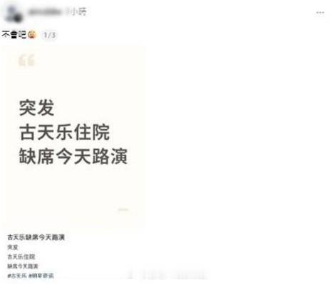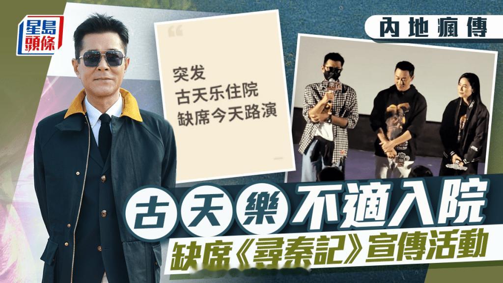 星岛:古天乐传在内地不适入院 今日曾戴口罩“死撑” 最后缺席《寻秦记》宣传活动影迷期待已久电影《寻秦记》于31日除夕上映,连日来大收旺场,主角古天乐跟大班演员到处宣传十分频朴,今日有粉丝透过社交平台表示“突发,古天乐住院,缺席今天路演。”,在网上亦有传古天乐今天在佛山宣传时,仍有戴口罩现身,但之后已没有跟大队宣传,疑似身体抱恙不适进院。传古天乐正身在内地医院古天乐、林峯、宣萱、白百何、苗侨伟等艺人,近日在内地不断出席宣传活动,但今日有粉丝于社交平台指:“突发,古天乐住院,缺席今天路演。”,随后亦有网民爆料:“是,我去的那场,阿峯(林峯)一来就讲Daddy抱恙来不到宣传。”传古天乐今天曾抱病勉强宣传有指今天的佛山宣传,古天乐都有现身,但当时古天乐已戴上口罩似有不适现象,到之后的场次已经不见古天乐身影,而只剩下林峯、朱鉴然和宣萱。不少网友都大为担心,在网上留言希望古天乐快点康复。《寻秦记》演员马不停蹄宣传,行程被排得满满,一众演员本月4日亦会在港进行宣传。