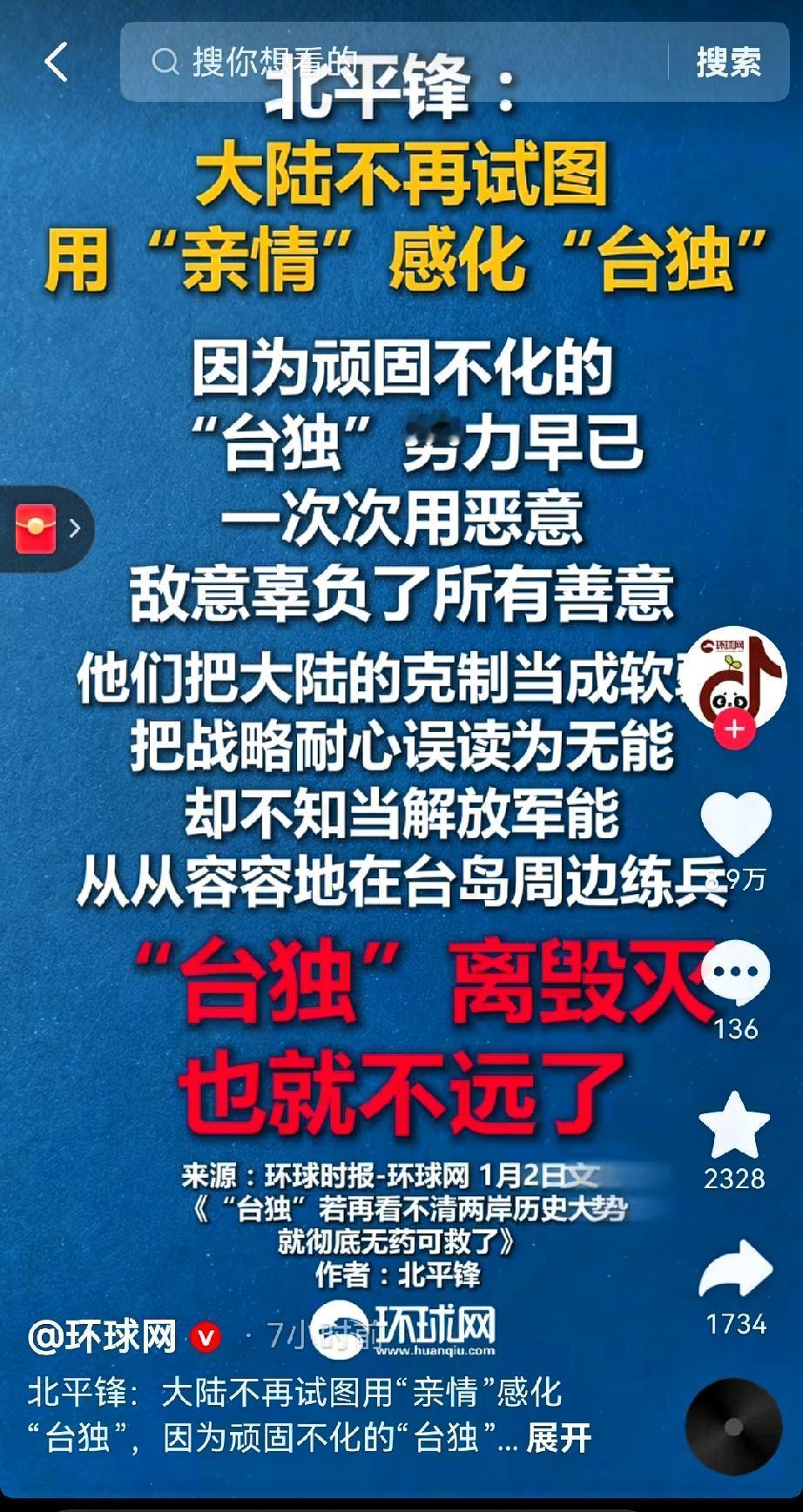 这波言论真的解气! 环球时报“北平锋”1月2日的发文, 算不算给“台独”势力敲响了最响的警钟? 那些年的惠台政策、融合发展机遇,都是真心实意想让两岸同胞共赢。可“台独”分子把善意当软弱,把克制当无能,赖清德之流甚至喊出“境外敌对势力”的谬论,一心要割裂血脉纽带。 现在终于明确了,对顽固“台独”没必要再谈感化,他们的字典里根本没有“同胞情”。我们对台胞的诚意不变,但反“独”的决心更坚。解放军的常态化演训、惩“独”工具箱的不断丰富,都在证明统一大势不可挡。