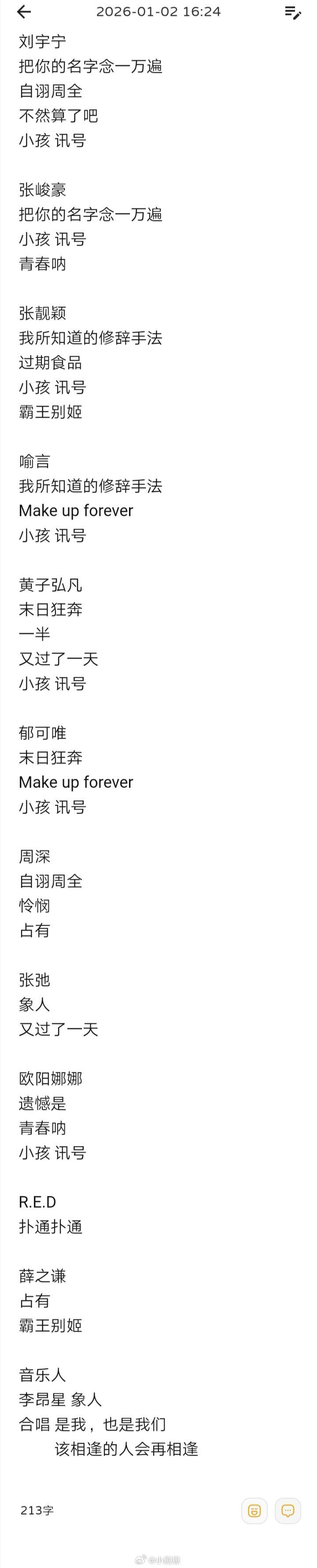 统计了一下每位歌手演唱的曲目期待盛典!!有点遗憾薛没有独唱...(曲目基本按节目单顺序)