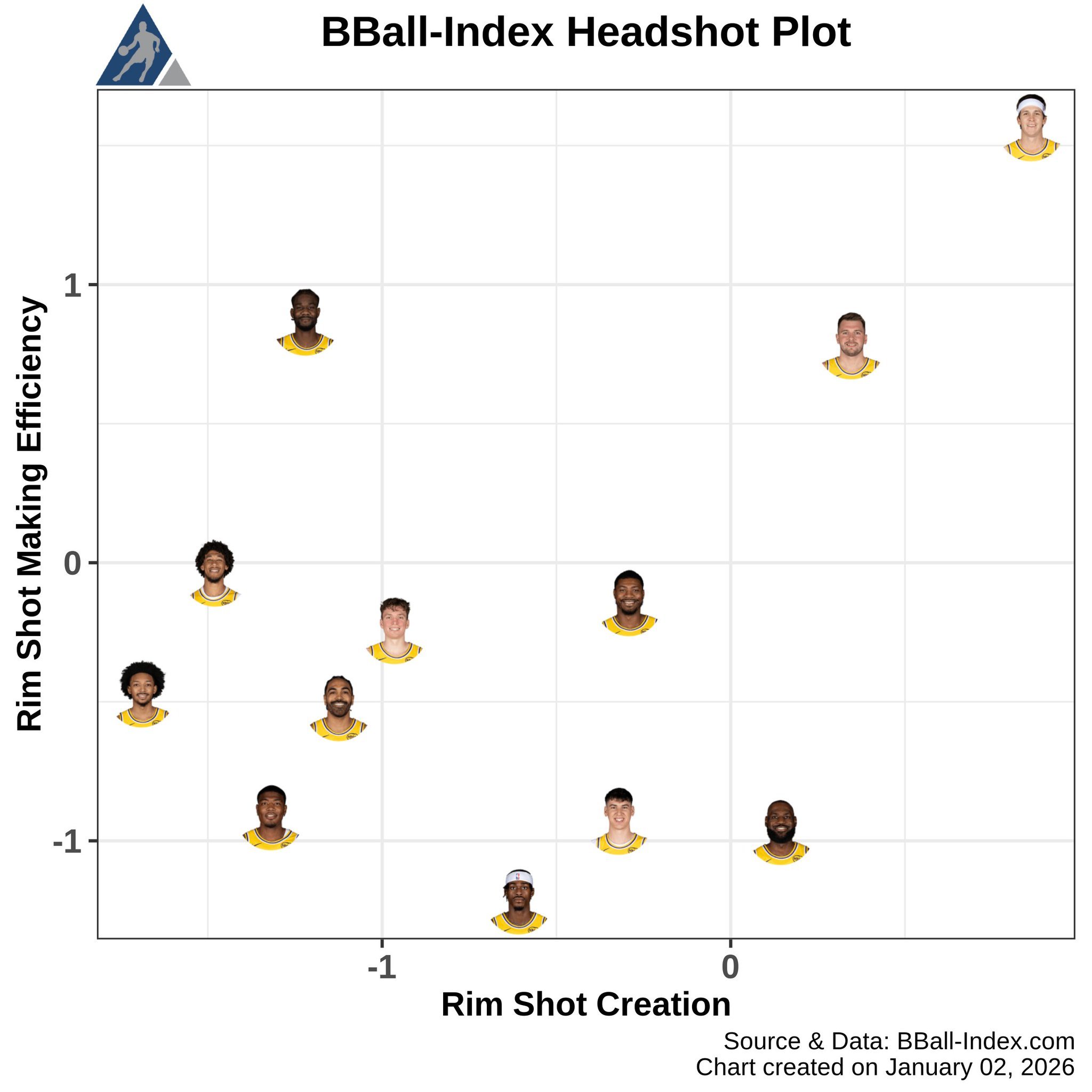 BBall-Index湖人队的篮下进攻指标:横轴:数值越大,球员自主创造篮下得分机会的能力越强;数值越小,创造篮下机会的能力越弱。纵轴:数值越大,球员把握篮下得分机会的效率越高;数值越小,篮下终结效率越低。顶级双能球员:图表右上角的球员,同时具备极强的篮下得分创造能力和终结效率,是湖人篮下进攻的核心支点。高效终结型:纵轴高、横轴低的球员,篮下终结效率出色,但自主创造得分机会的能力较弱,更依赖队友喂球。机会创造型:横轴高、纵轴低的球员,能为球队创造篮下得分机会,但自身终结效率偏低。双弱型:图表左下角的球员,篮下得分创造和终结效率均处于下风,是湖人篮下进攻的短板环节。