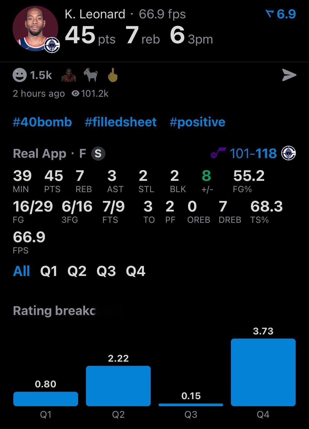 随着快船一波6连胜!!!快船队球员得分情况如下!莱昂纳德:出战23场,场均上场
