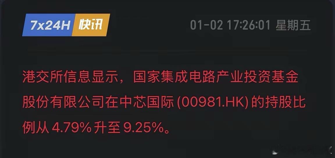炸裂了!大基金“加倍下注”中芯国际,不是救市,是宣战!港交所最新披露震撼市场,国家集成电路产业投资基金对中芯国际的持股比例从4.79%大幅增持至9.25%,几乎翻倍。释放了强烈信号——在外部技术封锁加剧、国产替代进入深水区的关键时刻,国家队正以真金白银力挺中国晶圆制造“压舱石”。作为中国大陆规模最大、技术最先进的集成电路代工企业,中芯国际承担着14nm及FinFET工艺量产、成熟制程扩产保供、以及未来先进封装与特色工艺突破的多重使命。此次大基金大幅加仓,强化了国家对半导体产业链安全的战略定力。此轮增持发生在中芯国际加速扩产北京、深圳、上海等12英寸晶圆厂,且持续优化资本结构、提升产能利用率的背景下。大基金此举既是长期价值投资,更是为后续技术攻坚与产能建设提供坚实后盾。大基金“加倍下注”,不只是看好一家公司,更是押注整个中国智造芯的未来。