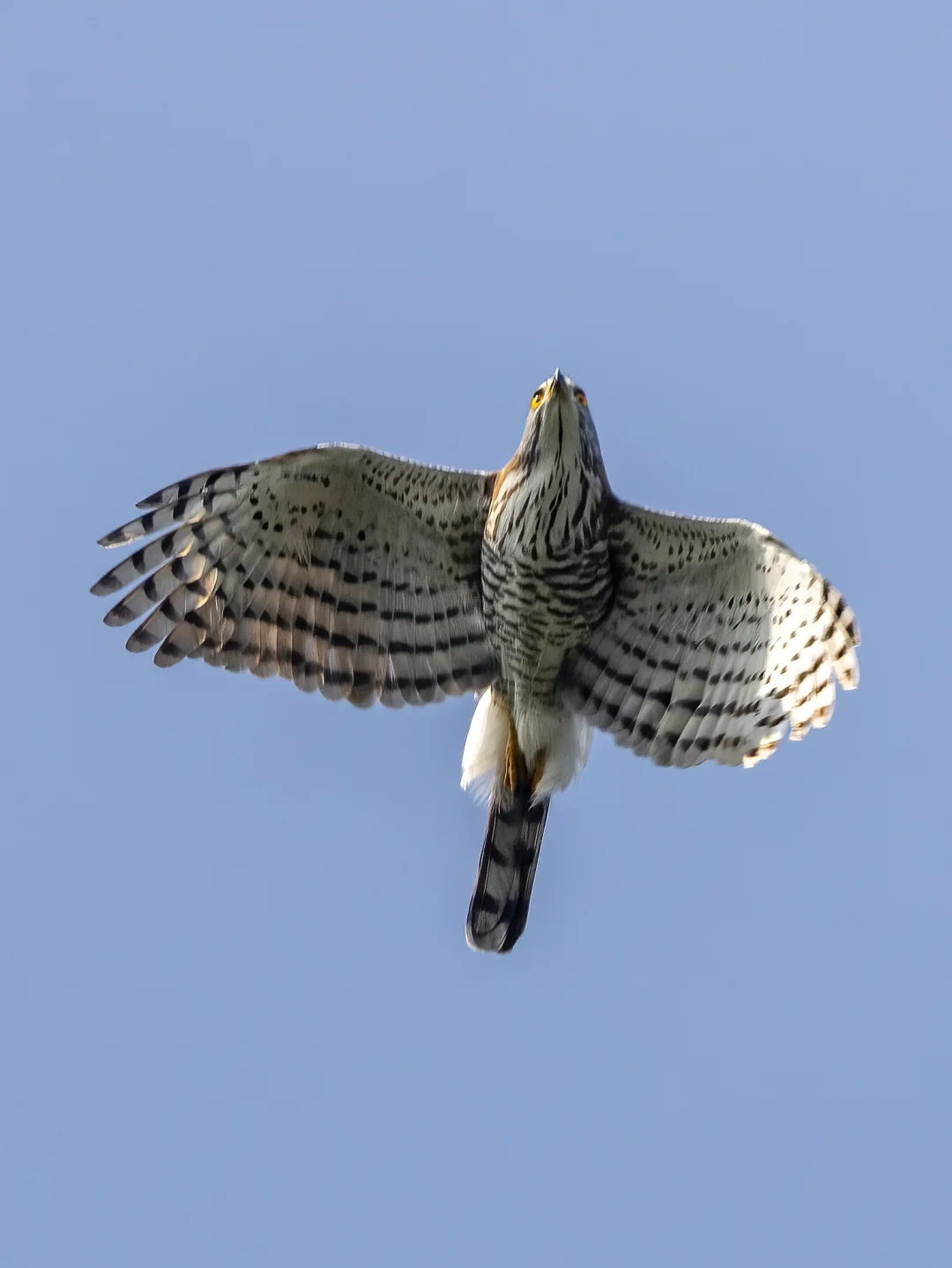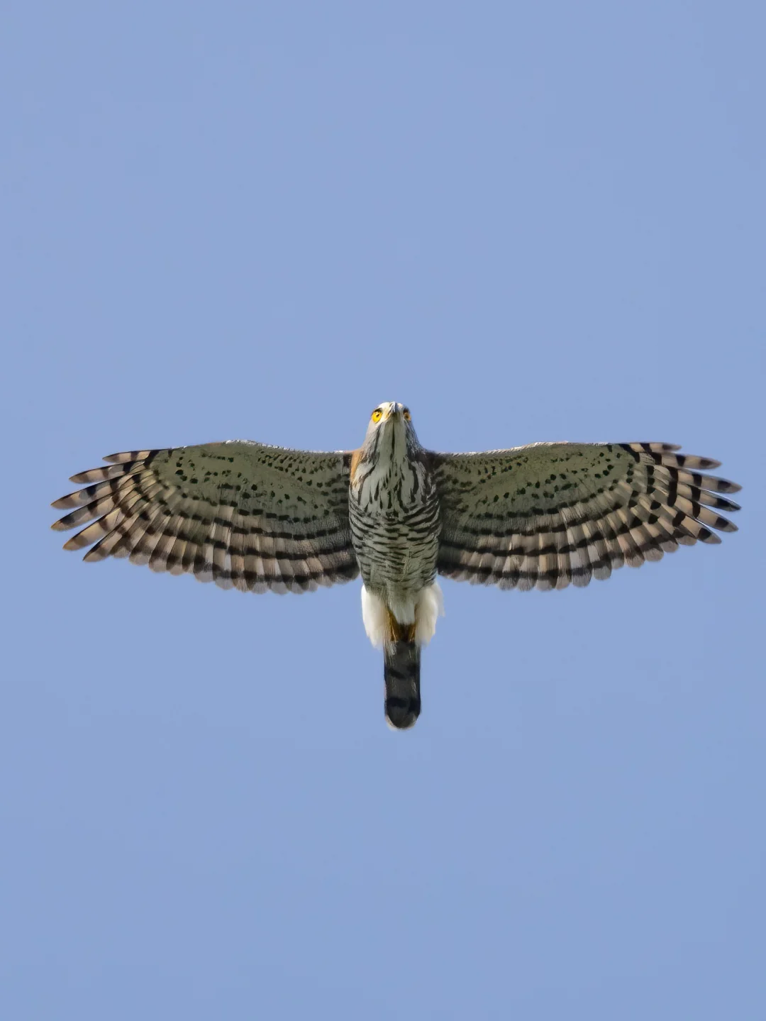 原创拍摄于2024.10 凤头鹰,鹰形目鹰科鹰属。飞翔的凤头鹰,六根翼指,圆翅,以及过于厚重的尾下覆羽是它的特征。尤其是尾下覆羽的白羽毛,被称为"白色尿布"哈哈,咳咳,是"白色纱裙"。 重庆今年秋季猛禽迁徙已经快要进入末段,除了雕雕,这些小鹰的出现也是让人眼前一亮的。可惜今年没怎么上山。