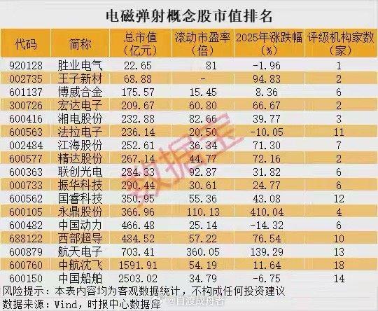 成本直降90%!电磁弹射技术的重大突破,正引爆一个千亿级新赛道。2025年12月31日午后,联创光电的股价上演“直线拉升”——从下跌近2%到封死涨停,用时不到1分钟。这波异动的背后,是其旗下联创超导传来的重磅消息:“大功率低温制冷系统与模型超导磁体研制服务项目”顺利交付验收。这标志着该公司在商业航天电磁发射领域的首个工程化订单落地,从技术研发到全流程交付的闭环已打通,为后续批量化生产铺好了路。电磁弹射为何被称作“科技飞跃”?这项以电磁力驱动的发射技术,能将物体加速到3000m/s以上,不仅初速度快、精度高,更关键是能耗低——传统火箭发射成本高达2000-5000美元/公斤,而电磁弹射有望压降至500美元/公斤以下,相当于成本砍去九成。更重要的是,它支持高频次发射,这对商业航天来说,无异于打开了“低成本、高周转”的新大门。目前全球电磁弹射技术已形成中美双雄领跑的格局。我国福建舰作为全球首艘常规动力电磁弹射航母,早已验证了技术的稳定性;四川资阳的超导磁悬浮电磁发射验证平台也完成了试验,商业化应用的脚步越来越近。市场空间更是诱人:未来十年全球军用电磁弹射市场规模预计突破200亿美元,中国占比将超30%;商业航天领域更被看好,2030年全球市场规模或达数千亿元,电磁弹射有望成为主导技术。这条产业链上,已有不少企业抢先布局。联创光电通过设立商业航天产业运营公司,直接切入电磁发射场景;湘电股份的电磁弹射与综合电力推进技术在特种装备领域市占率百分百,正拓展地面、机载新方向;王子新材的薄膜电容是电磁发射储能系统的核心部件,还间接参与了聚变能源相关项目;胜业电气研发的脉冲功率电容器,已瞄准电磁弹射等高端领域,其承担的广东重点项目正稳步推进。从机构关注度来看,航天电子、国睿科技等获十余家机构评级;市值上,中国船舶、中航沈飞等巨头超千亿元,而胜业电气、王子新材等小市值公司亦凭借细分领域的技术储备崭露头角。随着技术落地加速,电磁弹射正从军事领域向商业航天、新能源船舶等场景渗透。这场跨越机械能、化学能的技术革命,不仅改写着发射成本的计算公式,更可能重塑全球航天发射的格局——谁能在超导材料、脉冲储能、系统集成等关键环节站稳脚跟,谁就有望在这个千亿赛道里占据先机。