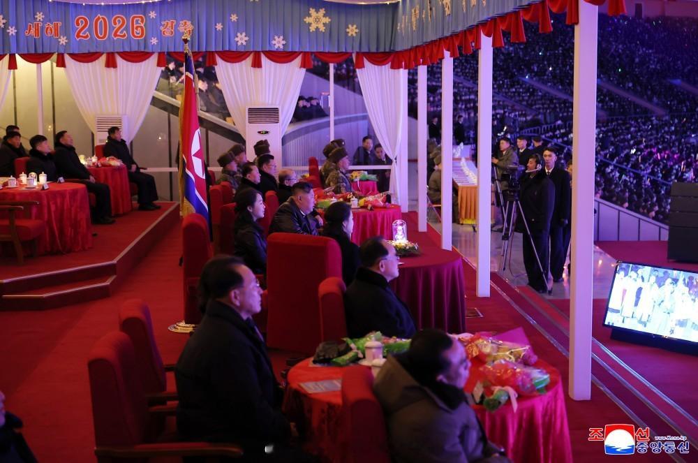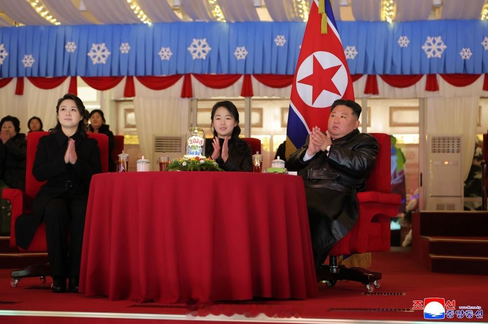 金正恩同志观看了跨年演出。在欢迎曲声中,金正恩同志步入观众席,全场一片欢腾。全体