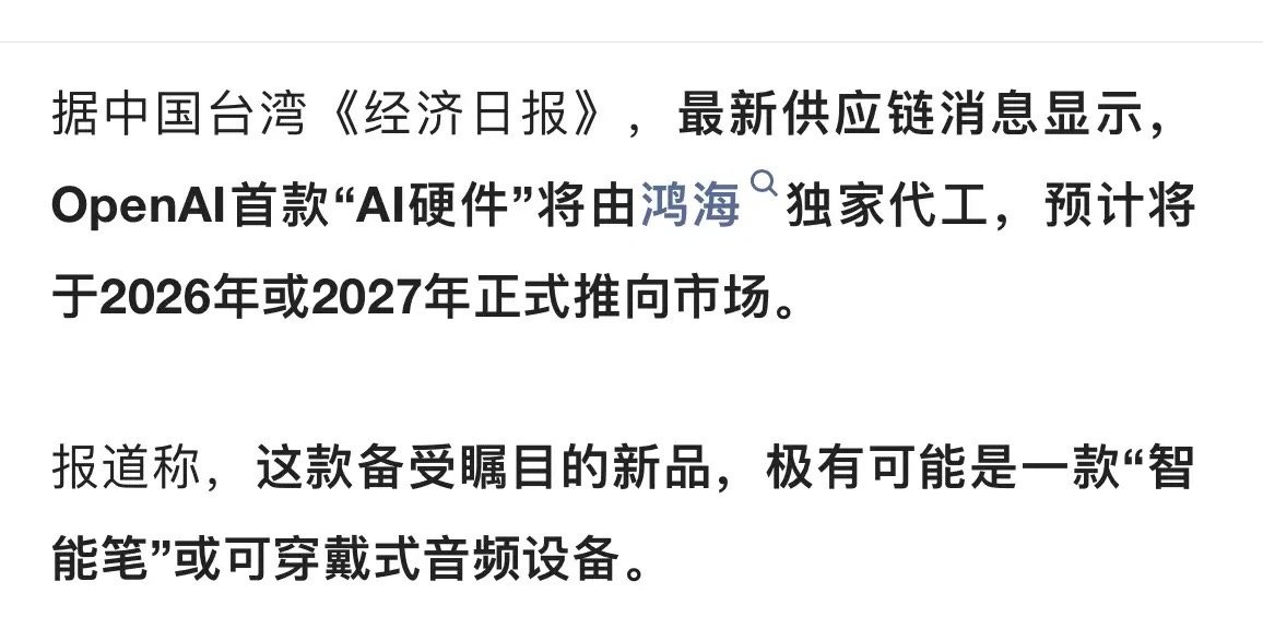 工业富联(鸿海)独家拿下OpenAI首款AI终端硬件订单,立讯出局这是AI代工领域的标志性事件,工业富联"云+端"全产业链闭环形成,短期股价将迎强催化,长期成长空间彻底打开!