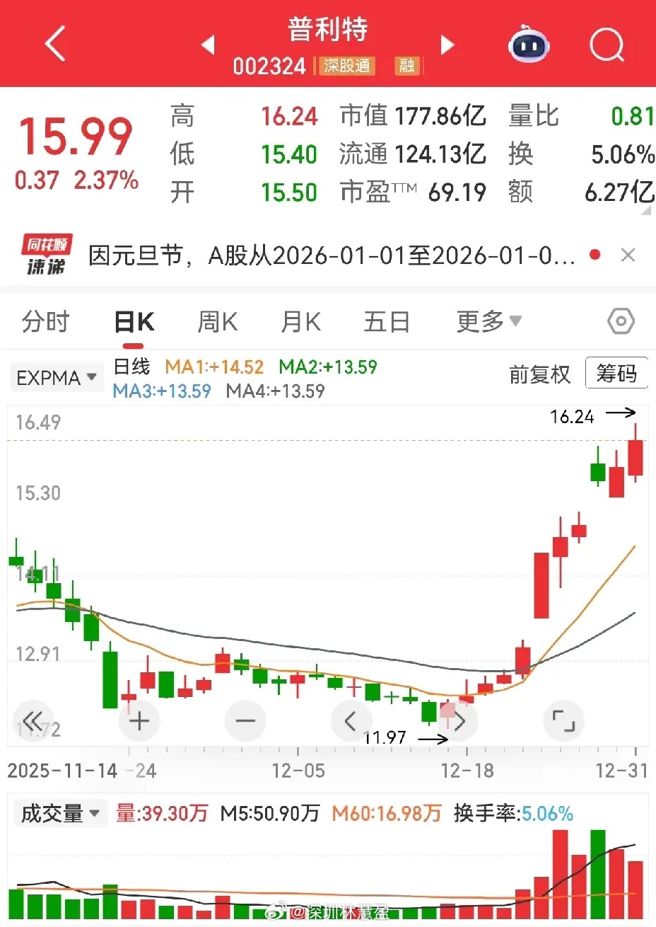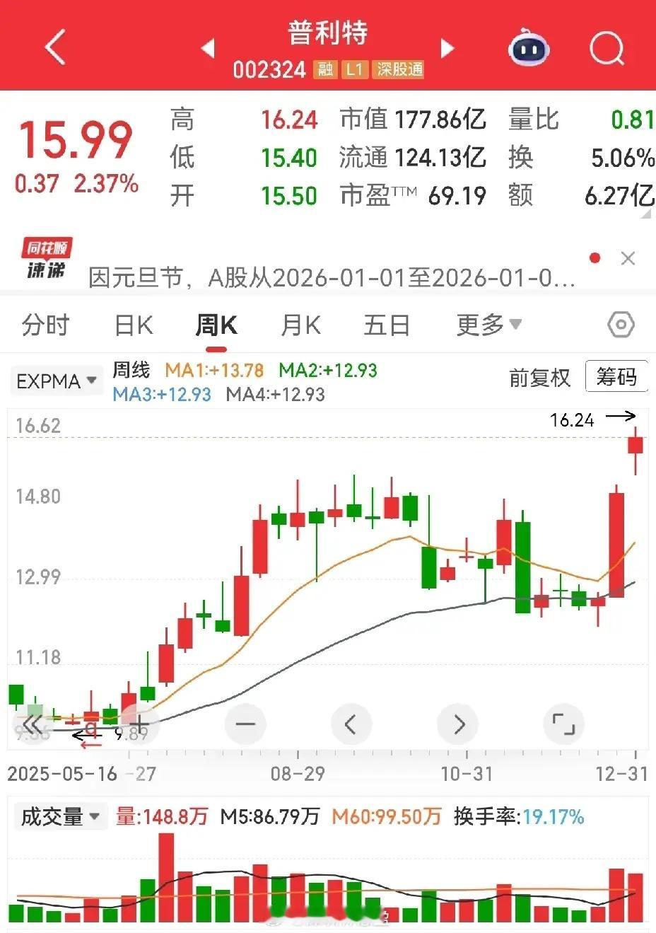 有一种形态,看上去涨得比较多了,一般散户不敢买。可是,往往不敢买的,又突突上涨,这个时候,我们就得研究研究他这是在干什么,在这个上涨的过程中有没有出货迹象。如果在上涨过程中,量能逐渐放大,筹码逐步分散,就要警惕了,反之则可以理解为主力真正积极运作中。普利特,周线看突破前期一个平台,日线看,涨停板上方的空中加油,是向上盘整状态的加油,连续五天量能保持在5%-10%以内,是一个温和放量状态。记不记得上周买的智光电气,有没有一点相似之处?