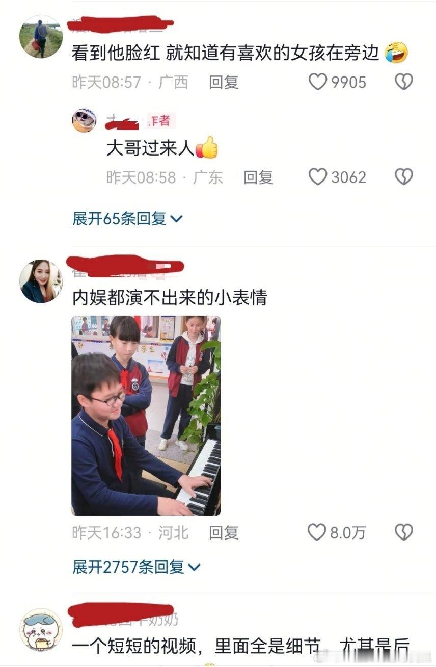 小男孩在弹琴,因为同学围观就不好意思地跑开了。仅仅一个对视,plq就yy出一男二女的狗血大戏。涉及隐私,孩子们的脸我就打码了,但原视频plq是肆无忌惮地截图逐帧分析,甚至有分析比对女孩面相的,我找了半天也只找到一两条正常评论。这个作者一开始在附和plq说“大哥过来人”,直到愈演愈烈怕出事才澄清“不存在的”“不要断章取义”