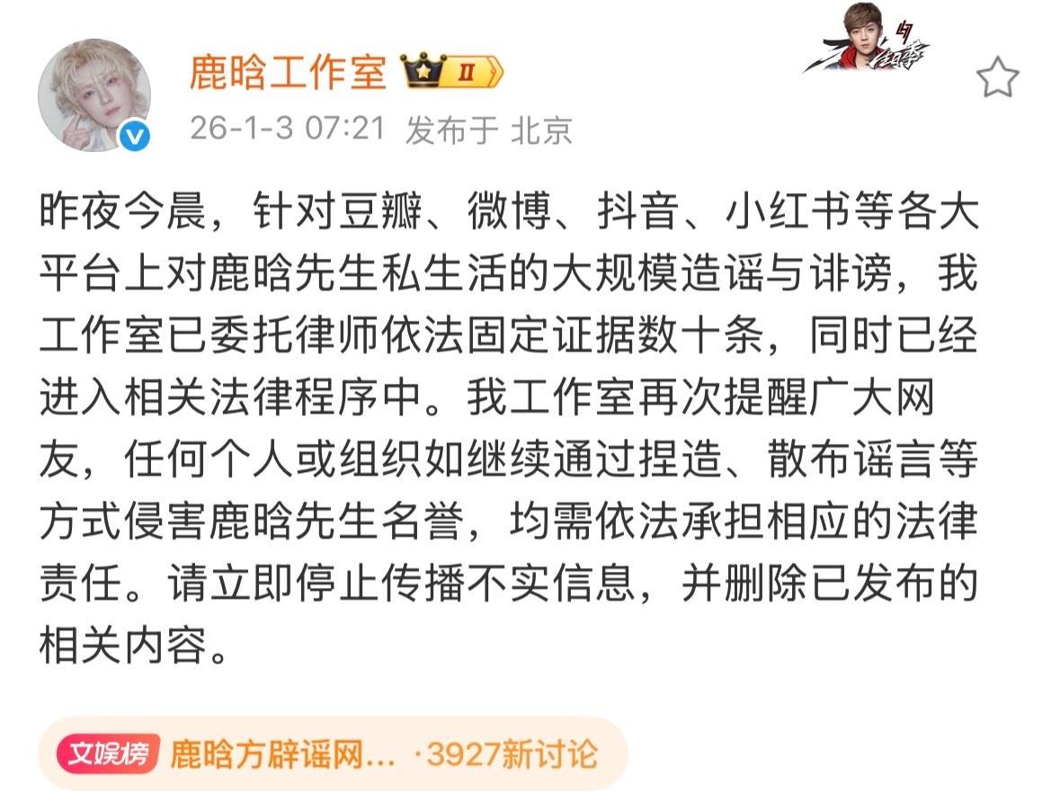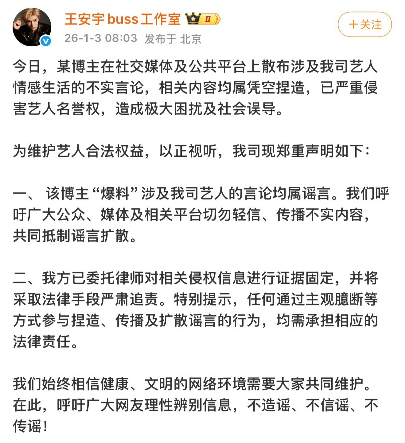 2026年1月3日内娱工作室声明最多的一个早上iamrooise