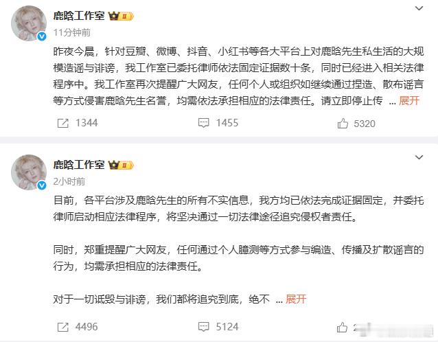 鹿晗工作室连发两条严正公告鹿晗工作室凌晨五点多连发两条严正公告!声明各平台的造谣行为完成证据固定,并委托律师启动法律程序。对于一切诋毁与诽谤,我们都将追究到底,绝不姑息! 不信谣,不传谣!支持鹿晗维权!2025娱乐年终盘点非正式跨年派对