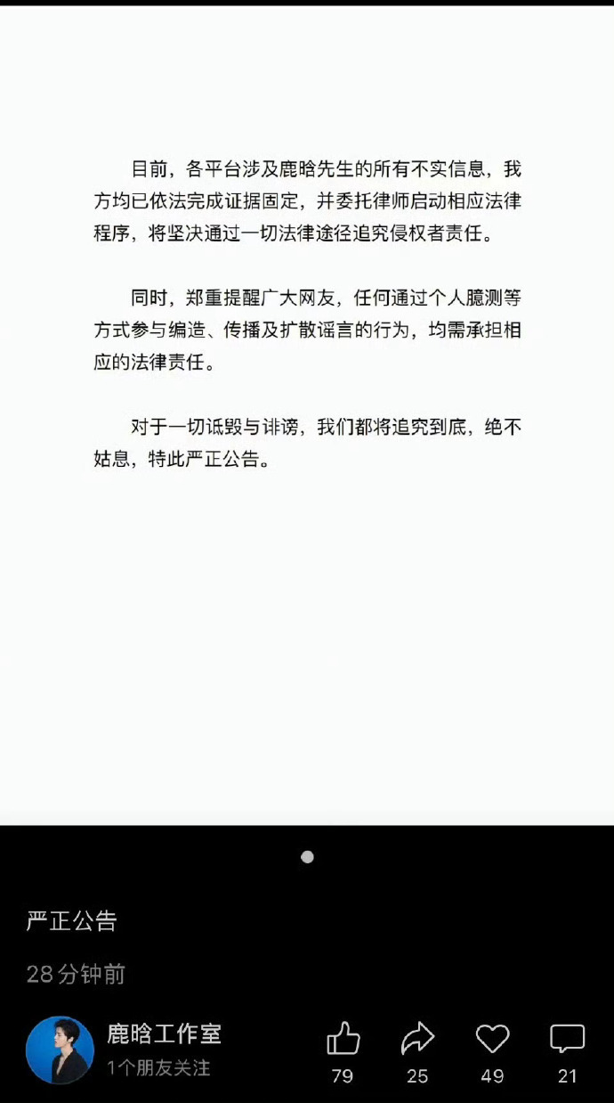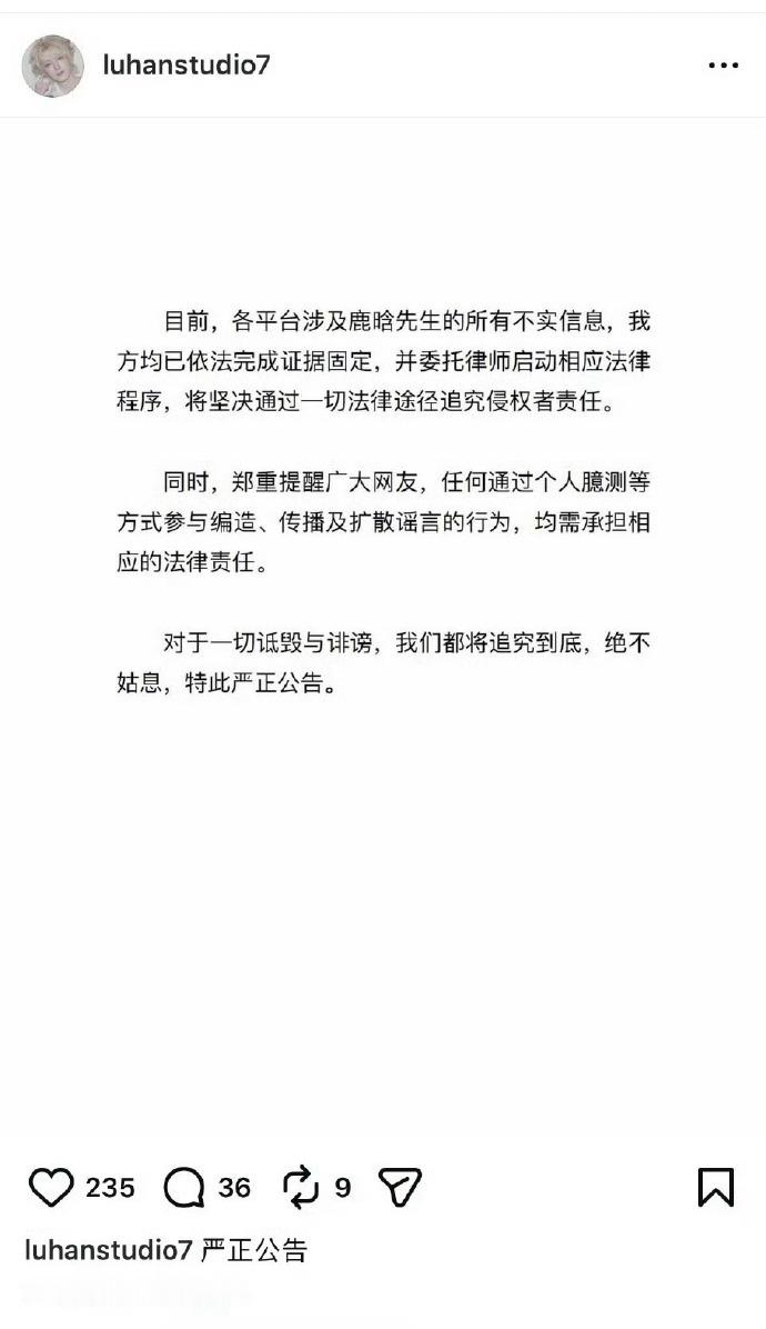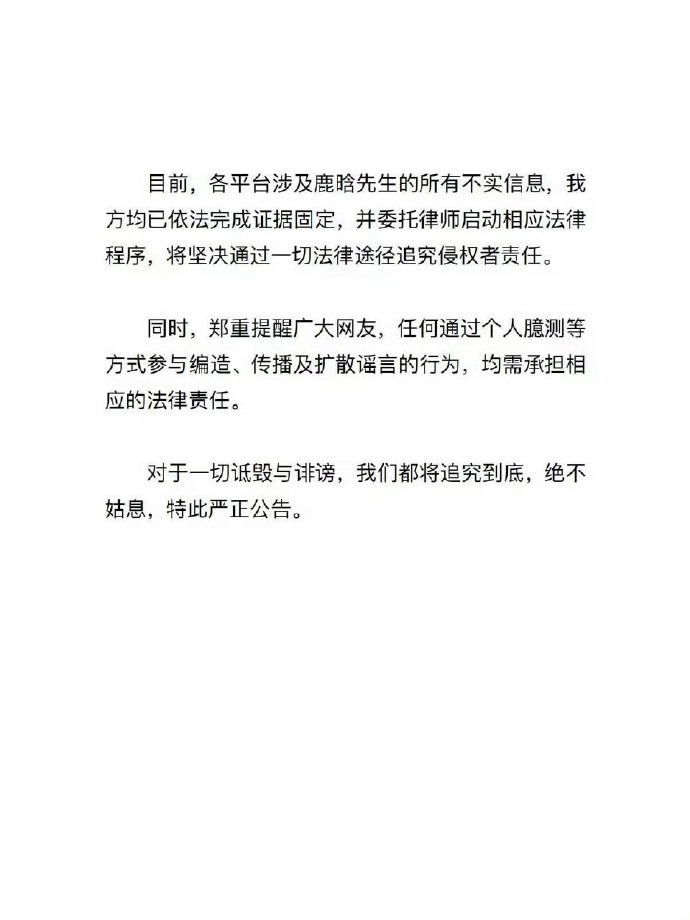 鹿晗方在全平台发了辟谣声明鹿晗方辟谣网传合照