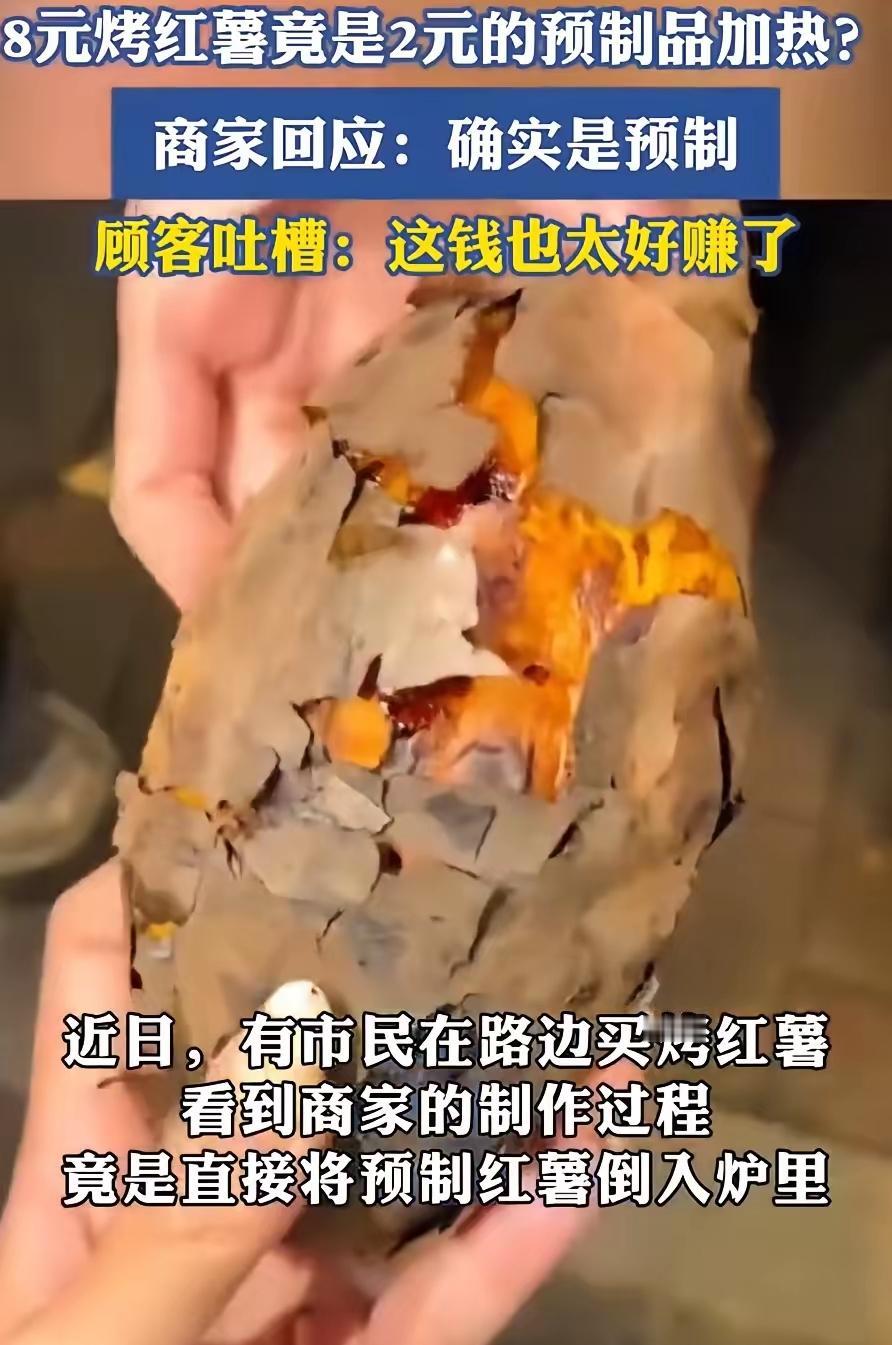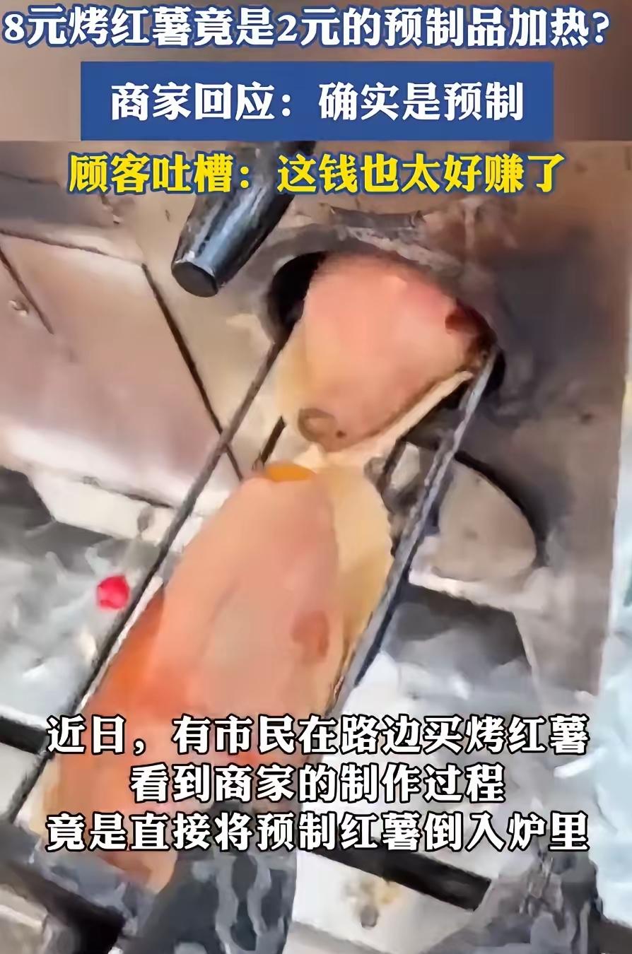 万万没想到,烤红薯也有预制版! 女子在街头看到有卖烤红薯的,突然心血来潮想要上去买一个,可在等待过程中,却发现制作过程和她想象的不一样,竟然是半成品“预制”的,而摊主也是大方承认,女子:你这钱也太好赚了吧 大冷天谁能拒绝一个热乎乎的烤红薯?女子本来满心欢喜凑过去,就等着那股炭火烤出来的焦香,结果眼瞅着摊主从塑料袋里倒出冻得邦邦硬的半成品,袋子上“冷冻烤红薯”几个字看得人心里拔凉。问摊主咋回事,人家倒实诚,直接说这就是预制的,加热就能卖。 女子当场吐槽:这钱也太好赚了!两块钱成本的东西,转手卖八块。可不是嘛,传统烤红薯得守着炭火慢慢翻,怕烤焦怕没熟透,预制的倒是省事儿,可那味儿能一样吗?我们馋的从来不是红薯那口甜,是蹲在炉子边等半天的期待,是掰开红薯皮时冒出来的烟火气,是带着点窑灰的接地气儿啊! 现在的小吃都这么“走捷径”了?你们愿意为这份少了烟火气的预制烤红薯买单吗?
