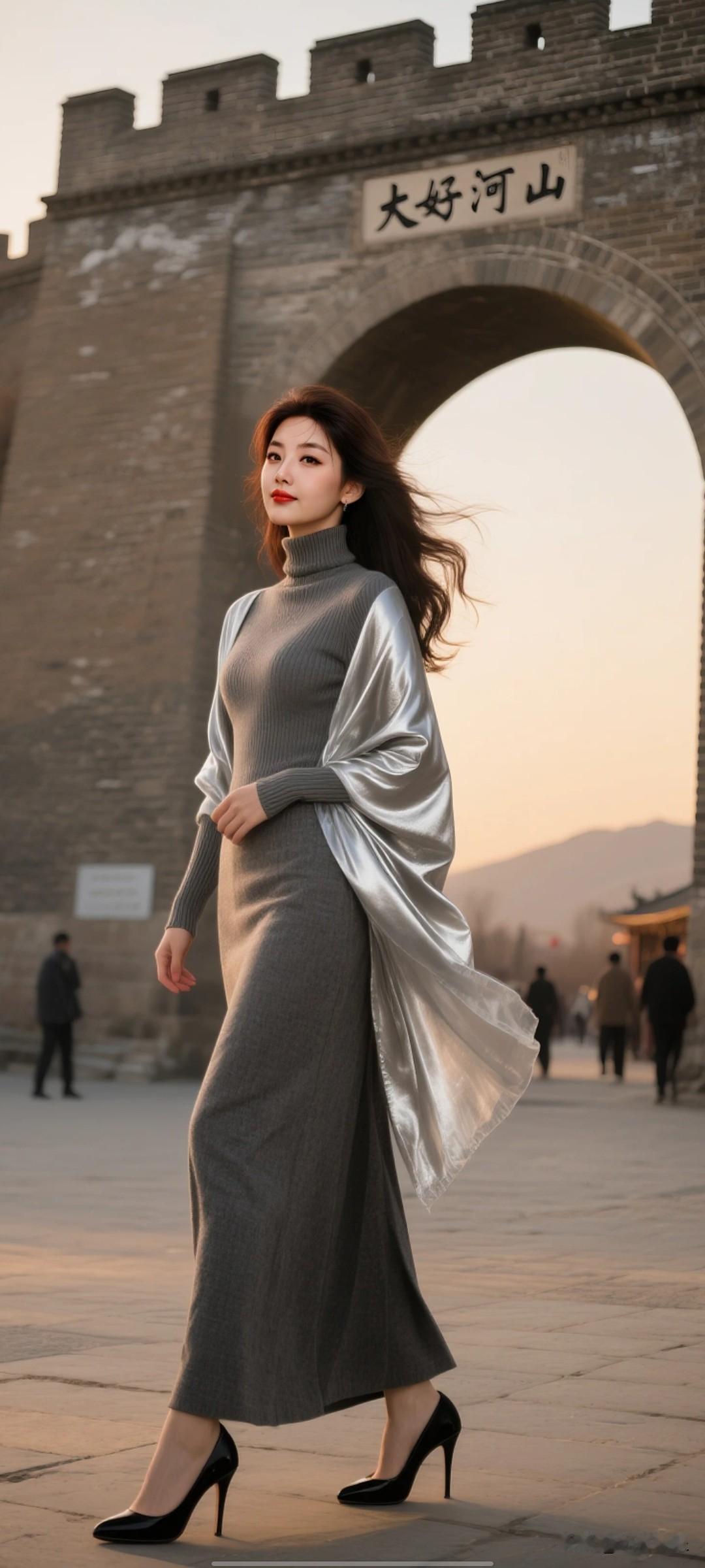 发型神态:深棕调长发微带蓬松凌乱感,几缕发丝轻垂脸颊,既保留了慵懒随性,又衬出冷艳氛围,发梢被寒风轻扬;妆容明艳,红唇与红衣相衬,抬眼时眼尾微微上挑,神色清冷又带点松弛感。 张家口大境门,明代长城关隘,单孔砖石拱门,风化青砖纹理,门洞上方“大好河山”牌匾,黄昏暖光侧照,城墙呈暖金色阴影,开阔广场有行人,复古暖调,写实主义,电影级光影,中景构图