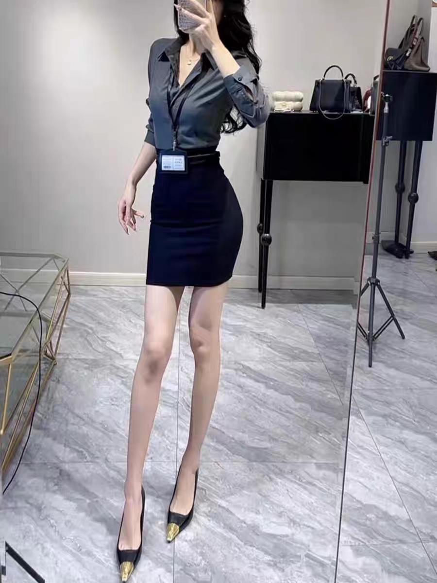 V领衬衫收腰包臀半裙套装。喜欢的穿搭分享 时尚包臀套装裙