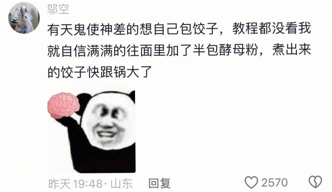 有天鬼使神差的想自己包饺子,教程都没看我就自信满满的往面里加了半包酵母粉,煮出来的饺子快跟锅大了
