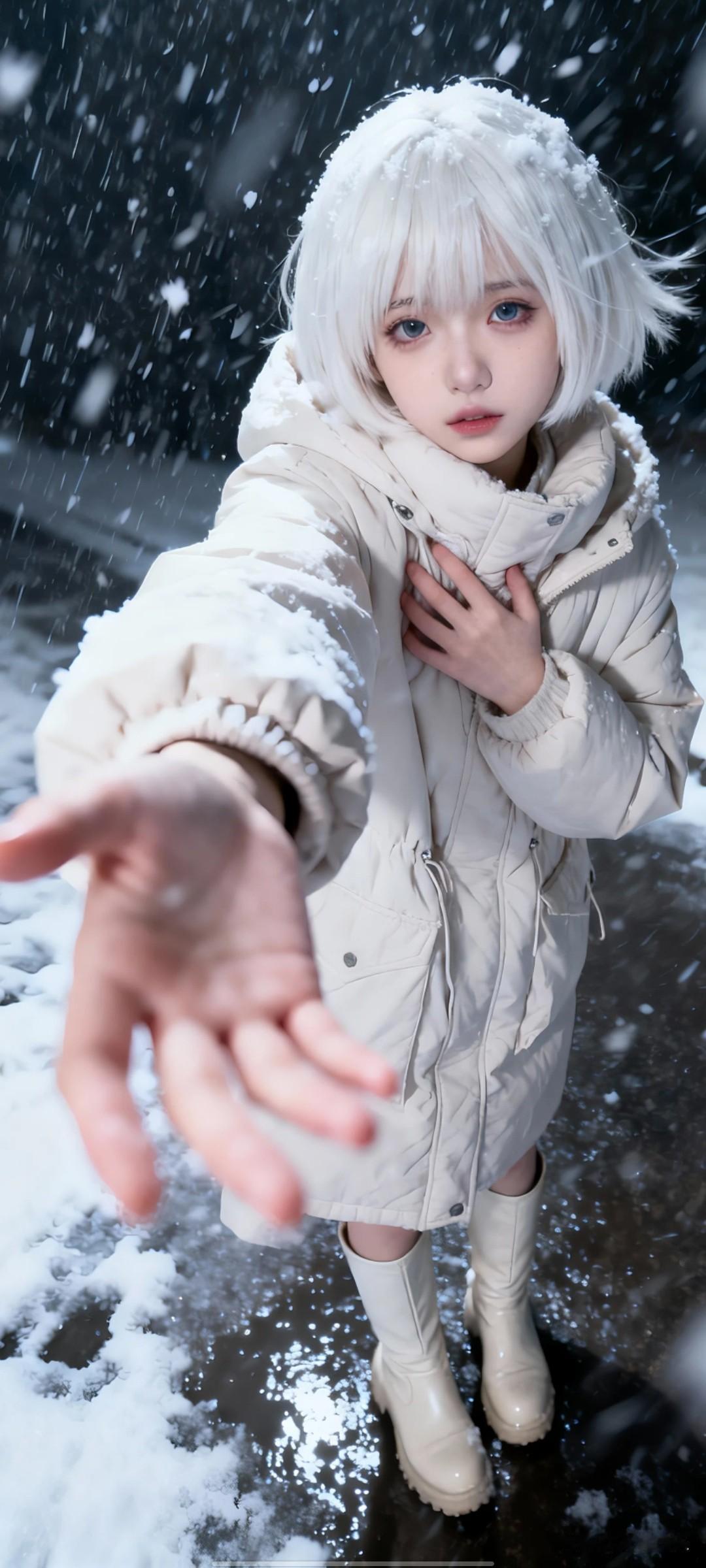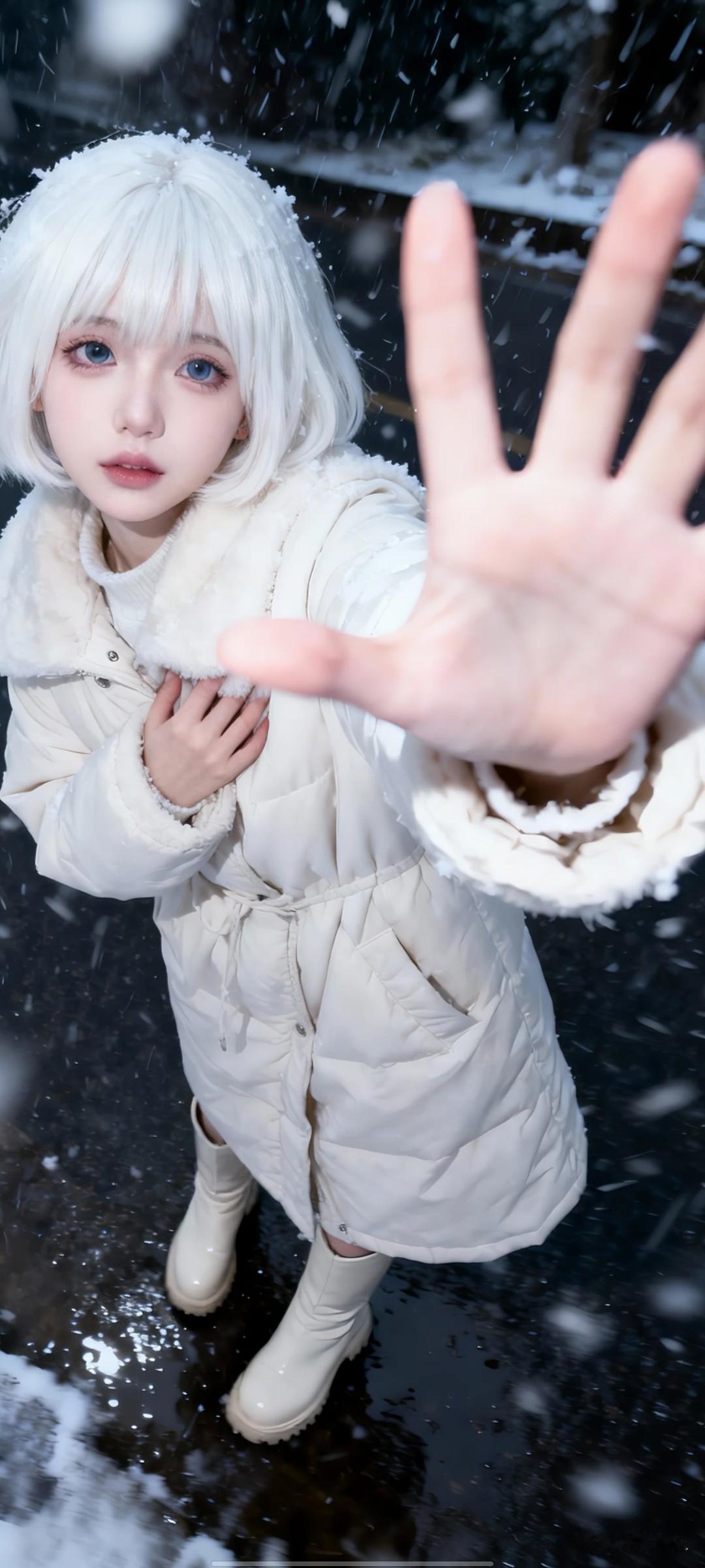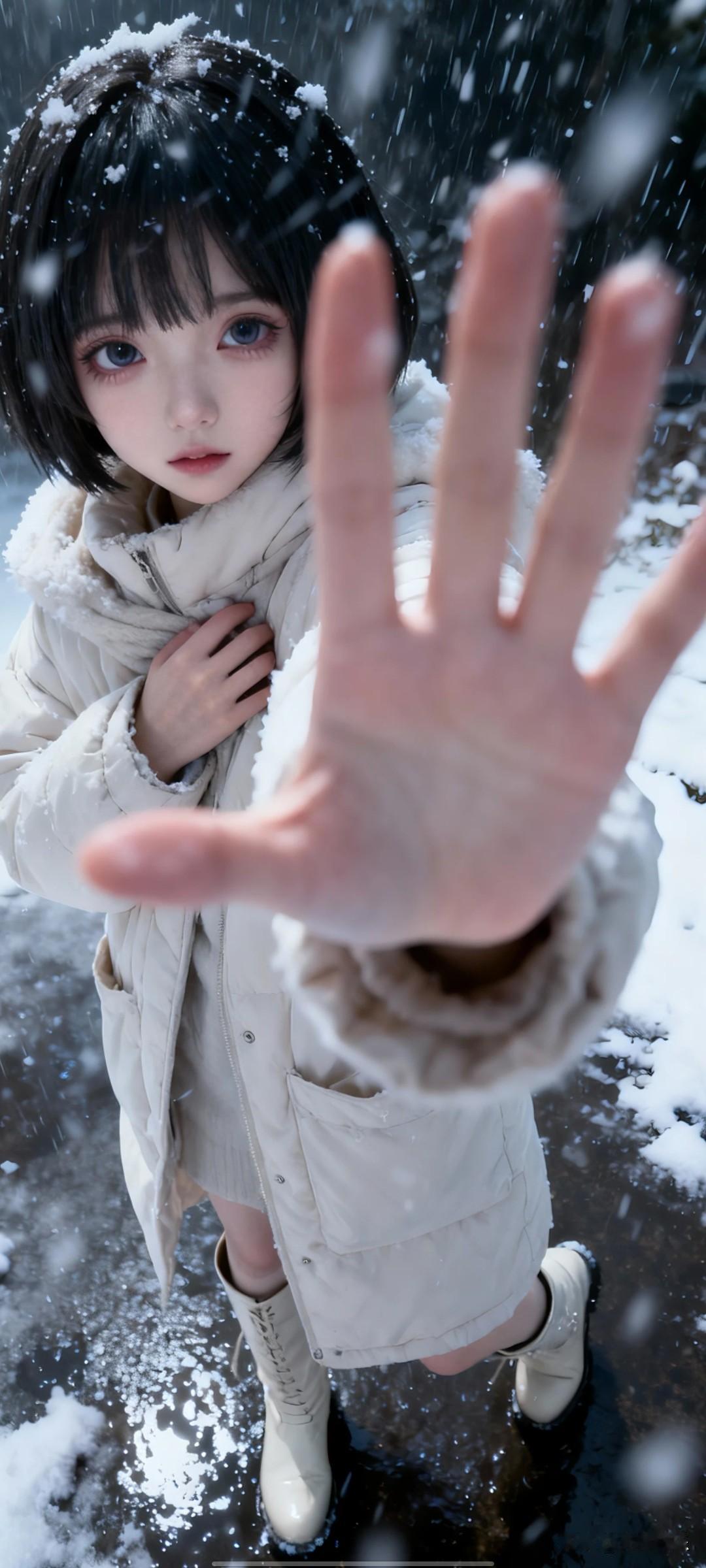 晒图笔记大赛电影级面光,光线追踪,冷白皮漫感光滑皮肤,无磨皮无柔焦,呈现真实质感,优越骨相,网感脸,网感妆,雨夹雪实景背景,雪花纷飞飘落,地面积雪湿润;短发洋娃娃般可爱的女生,身着浅色长款厚冬装+长靴,面露怯意,迎风瑟缩,手掌与镜头形成自然互动感,画面透着救赎氛围;抖动+高斯模糊+动态模糊叠加,快门速度不足带来自然运动模糊,构图歪斜无设计感,随性抓拍视角,低对比白色调为主,局部高清,深色加深泛朦;极致细节,多角度多元构图,网络爆款逻辑最优解;jwsd严选:动作自然随机,人物神态真实,绝对拒绝精致感与写真风,自然光拍摄,背景材质100%真实化,超现实写意高级感,真人质感拉满,边缘轻微失焦,非摆拍快照风格,氛围感爆棚杰作。晒晒少女靓影
