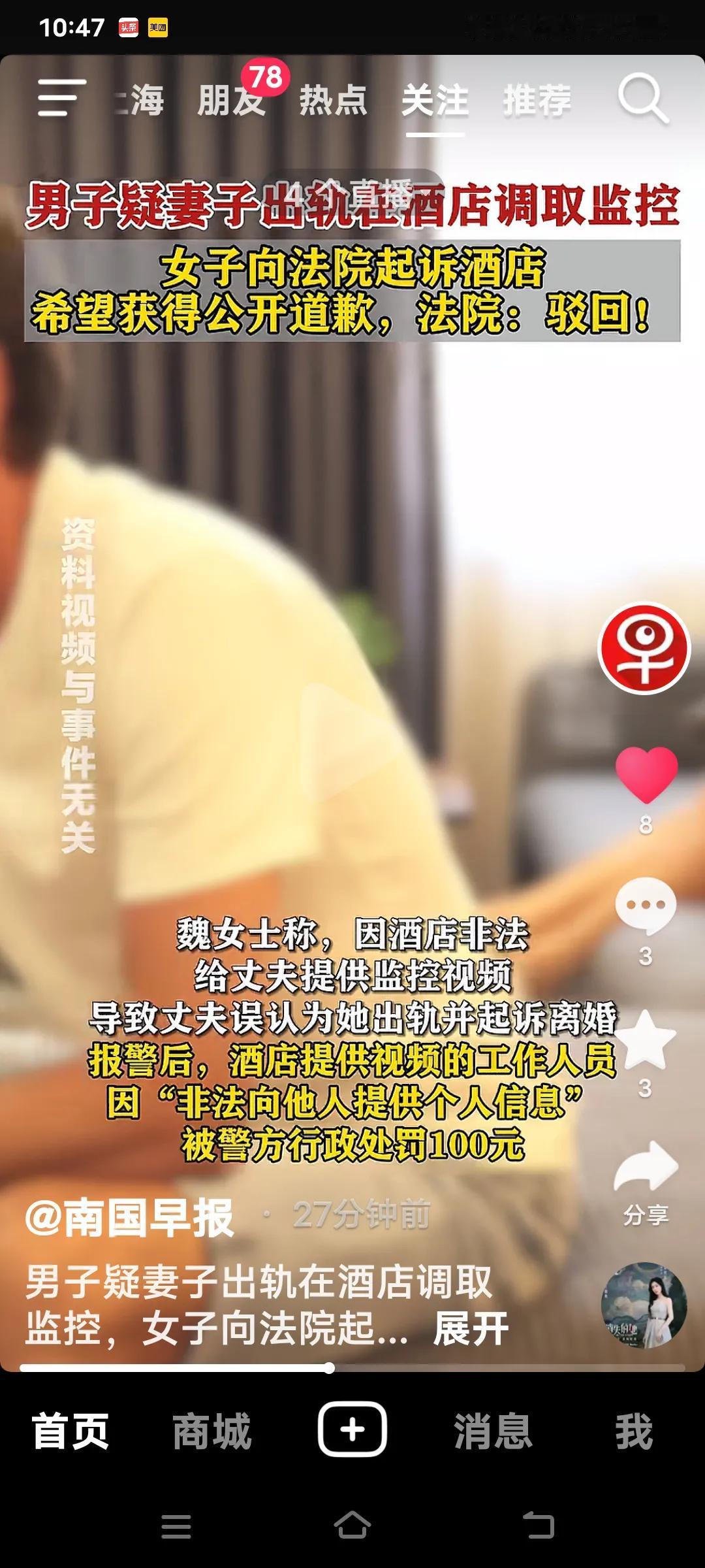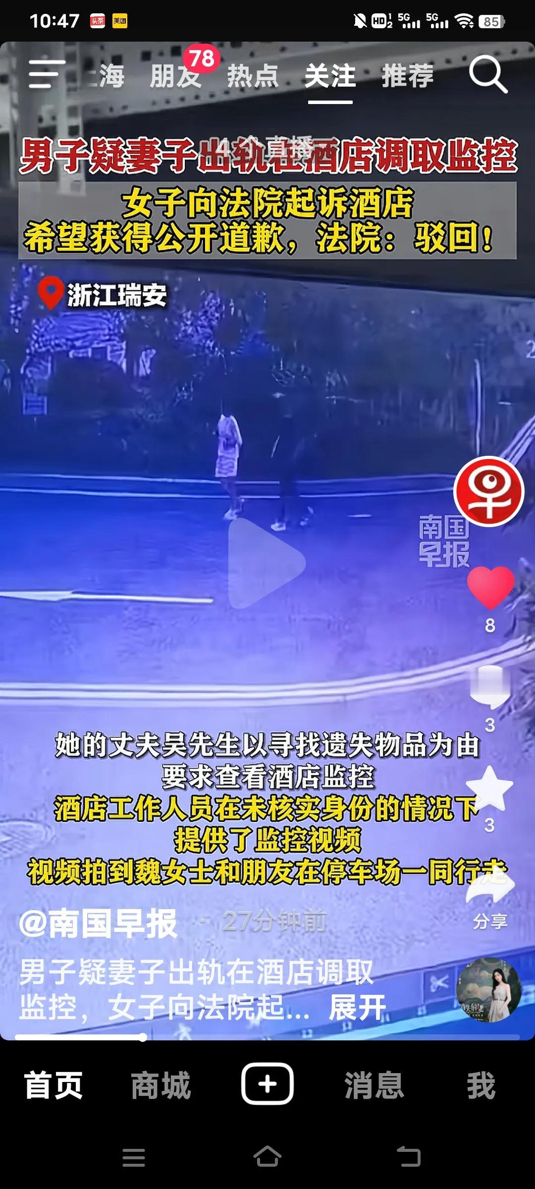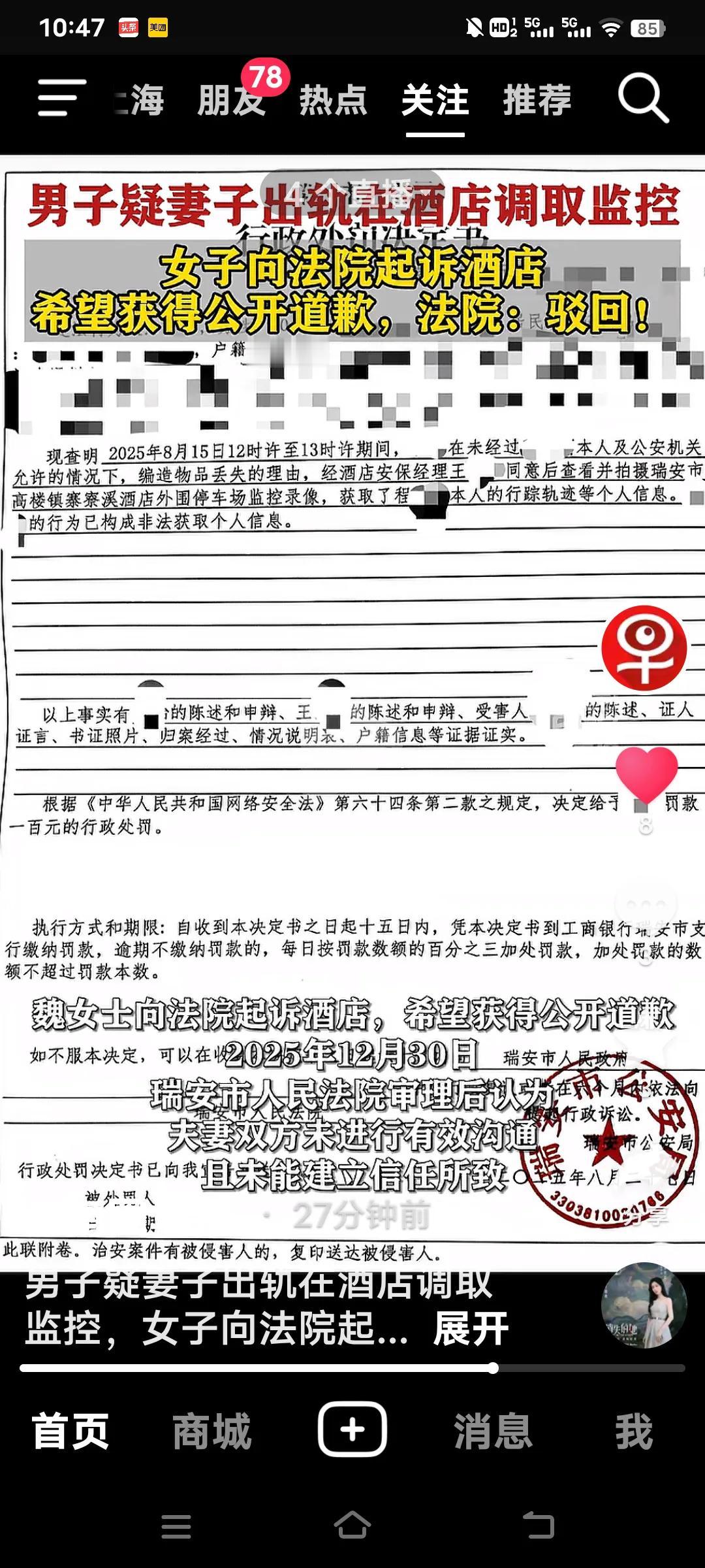 2025年8月11日,浙江瑞安的魏女士前往酒店与一位异性朋友用餐。朋友回房换鞋仅两分钟,两人便离开了酒店。 然而,她的丈夫吴先生却心生疑虑,怀疑魏女士出轨。次日,吴先生谎称找东西,要求查看酒店监控。酒店工作人员未进行核验,便直接让他查看并导出了视频。 警方认定,酒店工作人员和吴先生的行为均违反了相关规定,分别对他们处以100元罚款。魏女士认为酒店的做法使她遭受了他人的非议,于是起诉要求酒店公开道歉。但在2025年12月30日,法院驳回了她的诉讼请求。 1月2日,魏女士向记者透露,她和丈夫已经和好,误会也已消除。丈夫还撤销了离婚诉讼。确实如此,有些事情低调处理就不会失了体面,非要闹得人尽皆知,没事也会变成有事。处理事情还是理智一些为好,大家说是不是这个道理? 浙江女子出轨 浙江一女子出轨