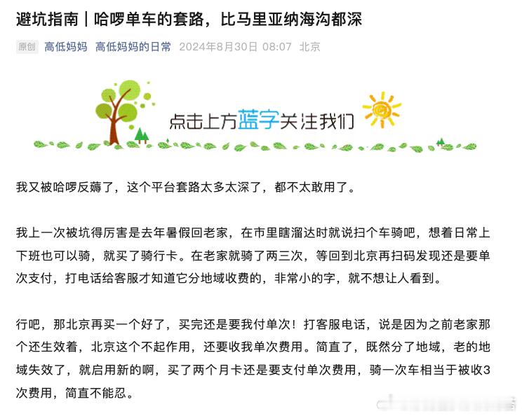 哈啰单车 哈啰单车“故障车照扣费”与“合规停车收调度费”,似乎更普遍。车链子是坏的,你扫码解锁38秒就关锁,照收1.5元。申诉?人机对话的循环地狱在等你。明明停在规定区域,其他车都能还好,就你这辆要收5元调度费。申诉?哈啰说可能是“定位漂移”。技术的问题,让用户的钱包买单!这误差率,就是哈啰稳赚不赔的“概率财”。还有“自动续费”的问题。最狠的一招在这里。你某次应急骑行,可能不小心点了个“自动续费”,或者根本没印象。之后,你忘了它。但它没忘了你。每个月,安静地从你账户划走一笔钱。有位用户,被连续续费10个月,一次未骑。找到客服,最初被告知:已过期的月份,不退。依据《消费者权益保护法实施条例》,自动续费前必须以显著方式提请消费者注意。哈啰提了吗?提得够“显著”吗?在用户坚持和法律条文面前,它最后退了。但那些没有坚持、不懂法条的用户呢?他们的钱,就成了沉默的贡品。