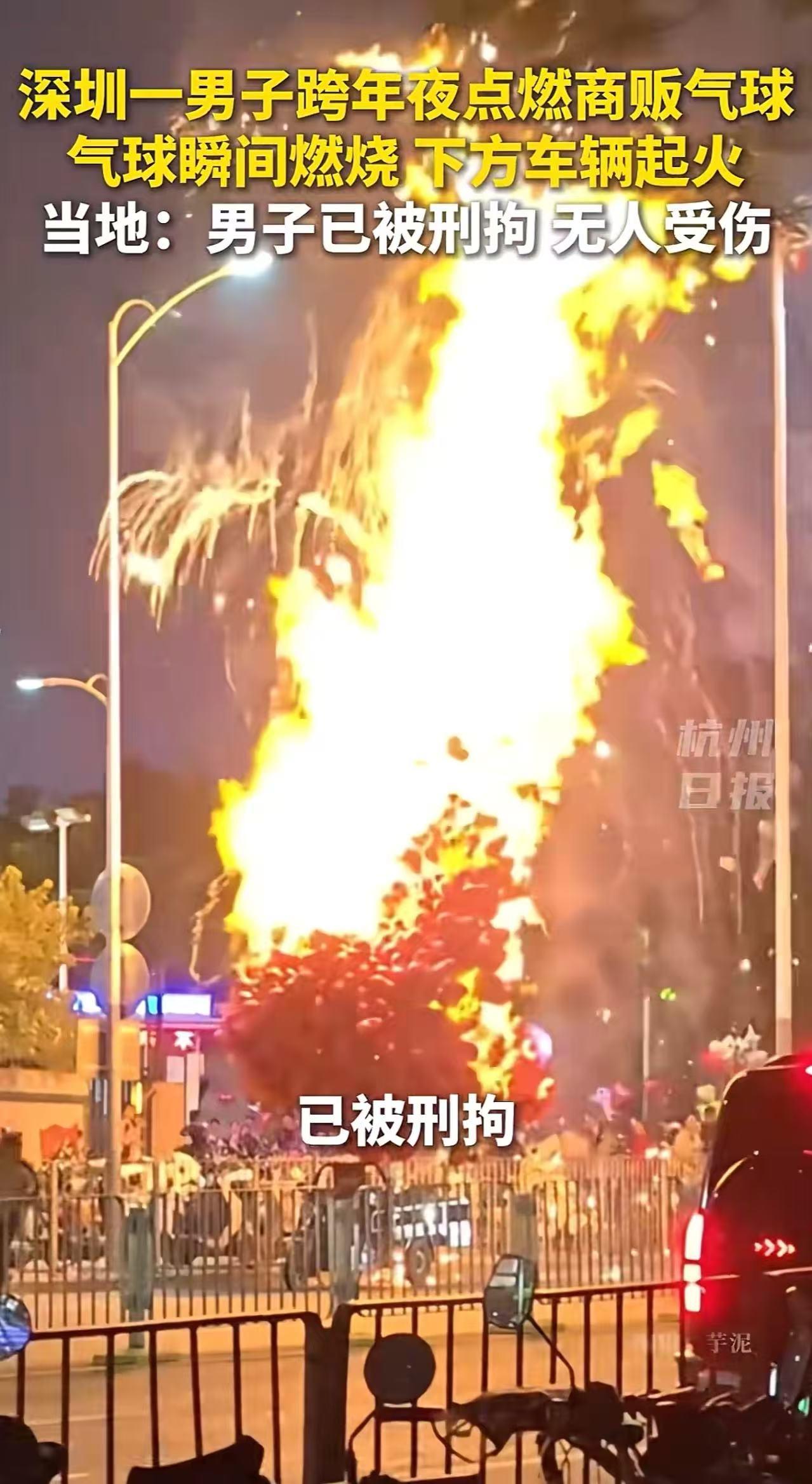 刑拘!深州,商贩跨年夜买气球,一男子却恶意用打火机把气球点燃,瞬间火光冲天!而男子以为这是一个恶作剧,却让自己付出了惨重的代价!网友:这不是玩笑,是从骨子里透出来的坏!万一引发火灾,他必须按纵火罪论处! 跨年夜,深圳的街头热闹非凡,商贩们瞅准时机,在街头摆起了摊,卖起了气球。那一串串红彤彤的气球,在微风中轻轻摇曳,为大街增添了浓浓的喜庆气息。 大家有序地排着队购买,等待着新年倒计时,准备一起把手中象征着美好祝愿的气球放飞天空,让它们带着自己的心愿飘向远方。 可是,一个男子却做出了令人发指的举动。他看到那些气球后,趁着小贩不注意,绕到小贩背后,掏出打火机,毫不犹豫地将气球点燃。 刹那间,火光冲天,气球剧烈燃烧起来。更可怕的是,燃烧的气球还引燃了下方的车辆,火势迅速蔓延,现场一片混乱。 幸运的是,这件事发生在消防救援站旁边。消防人员反应迅速,第一时间赶到现场,使用灭火器将明火扑灭,这才避免了人员伤亡的惨剧发生。 目前,涉事男子因酒后滋事,已被警方刑事拘留,等待他的将是法律的严惩。 此事引发热议,有网友说,这个如果是氢气球的话,这个点火的男人会把他的脸烧的稀巴烂,这个气球绝对不是氢气,应该是氦气,这个商贩是一个非常有责任的商贩,并没有使用被严禁使用的氢气。 也有网友说,这手有多欠,拿别人讨生活的手段取悦自己真是可恶至极,活该被刑拘,还要加倍赔偿人家损失。 还有网友说,这不是玩笑,是从骨子里透出来的坏!这是纵火,太危险了,气球燃烧会引起火灾,特别是人流密集的地方, 我想说,这名男子点燃的哪里仅仅是一团火啊!那是一个普通老百姓一家人的生计,是商贩辛苦劳作换来的希望。 这哪里是“手欠”或者“恶作剧”?这分明是骨子里的恶和对公共安全的极端漠视!拿别人的生计甚至生命安全来满足自己扭曲的取乐心理,这种“玩笑”成本太高,也太危险。 酒后失控不是万能的挡箭牌,成年人必须为自己的行为承担全部责任。这次是运气好没出大事,下次呢? 对这种毫无底线的破坏行为,法律必须严惩,让他为自己的一时“快感”付出沉重代价,也给所有潜在的“看客”和“恶作剧者”一个深刻的警示:危害公共安全,绝不是“好玩”二字可以轻描淡写带过的!