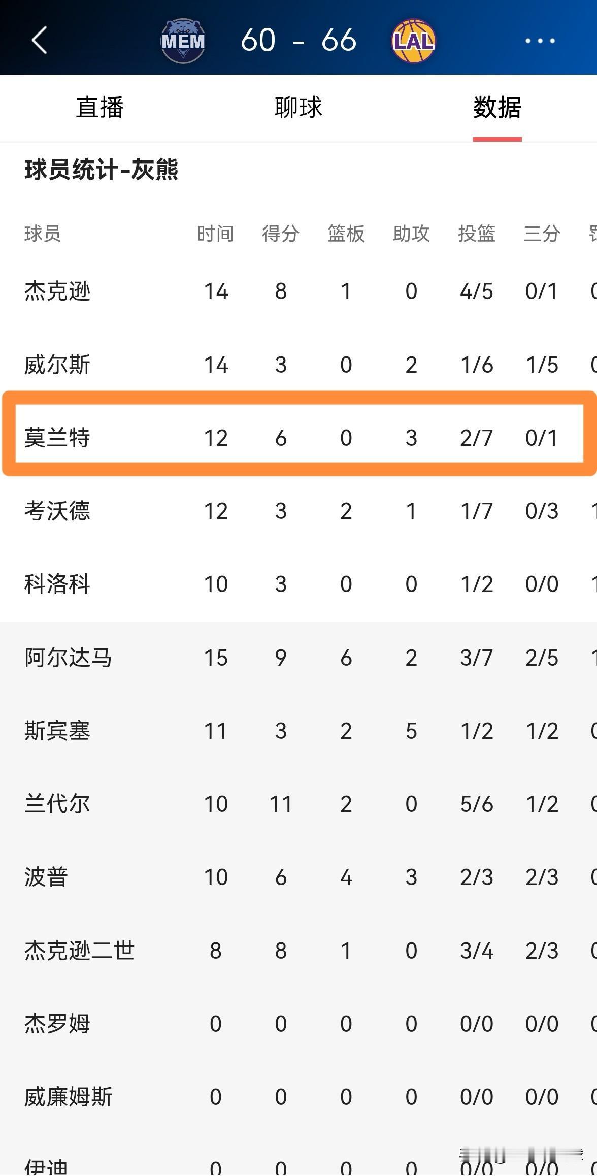 灰熊当家球星莫兰特真是太烂了!在今天灰熊客场挑战湖人的上半场比赛中,莫兰特的表现简直就是一场灾难,他在首发出战的12分钟里,投篮7中2,其中三分球1中0、罚球3中2仅仅得到可怜的6分,还有2次失误,他的场上正负值为-22。 在前两节比赛中,只要莫兰特上场,灰熊就会在攻防两端被湖人打爆,他完全是球队的负担和累赘。