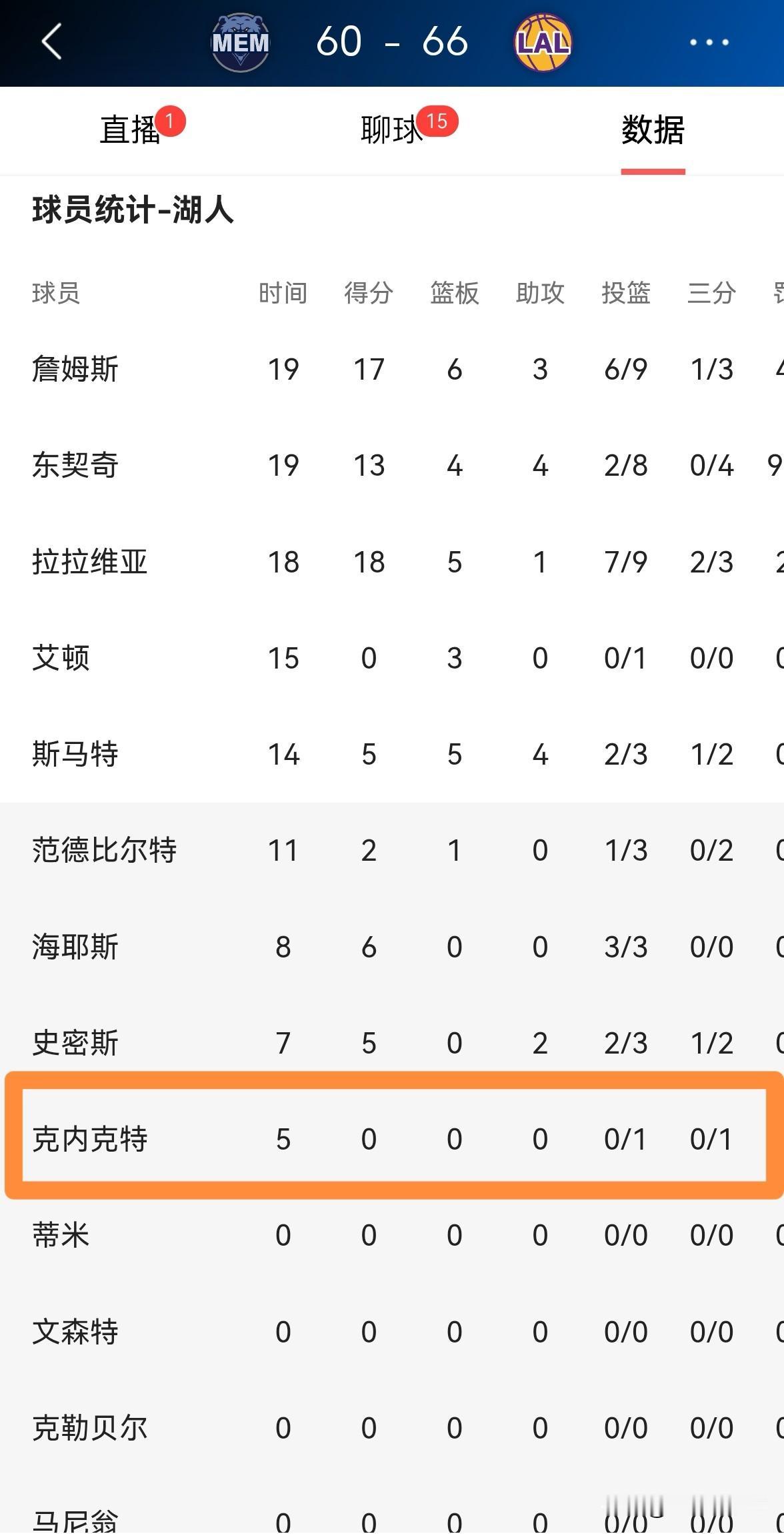 我忍不住要怒喷湖人新星克内克特,他真是一个给机会不中用的主。在今天湖人主场迎战灰熊的比赛中,目前双方的上半场比赛已经结束,湖人以66:60领先对手。值得注意的是,在前两节比赛中,克内克特破天荒的进入到了球队的轮换阵容,却表现糟糕,他在替补出战的5分钟里投篮1中0怒砍0分,可以说是毫无存在感。 不出意外的话,湖人主帅雷迪克在下半场比赛中一定会弃用克内克特。
