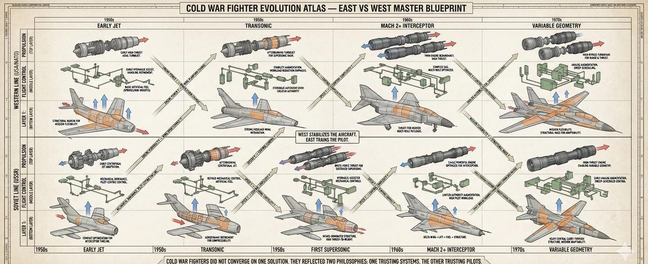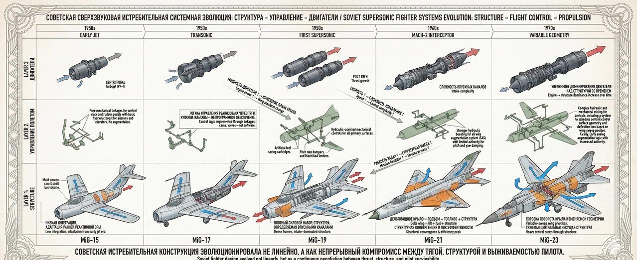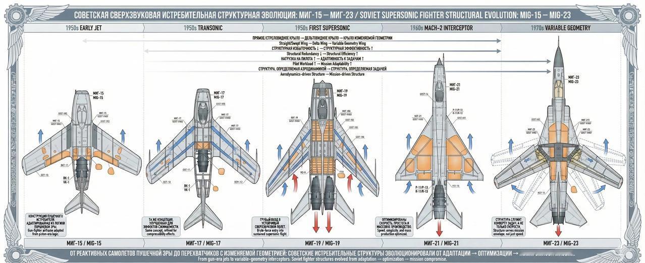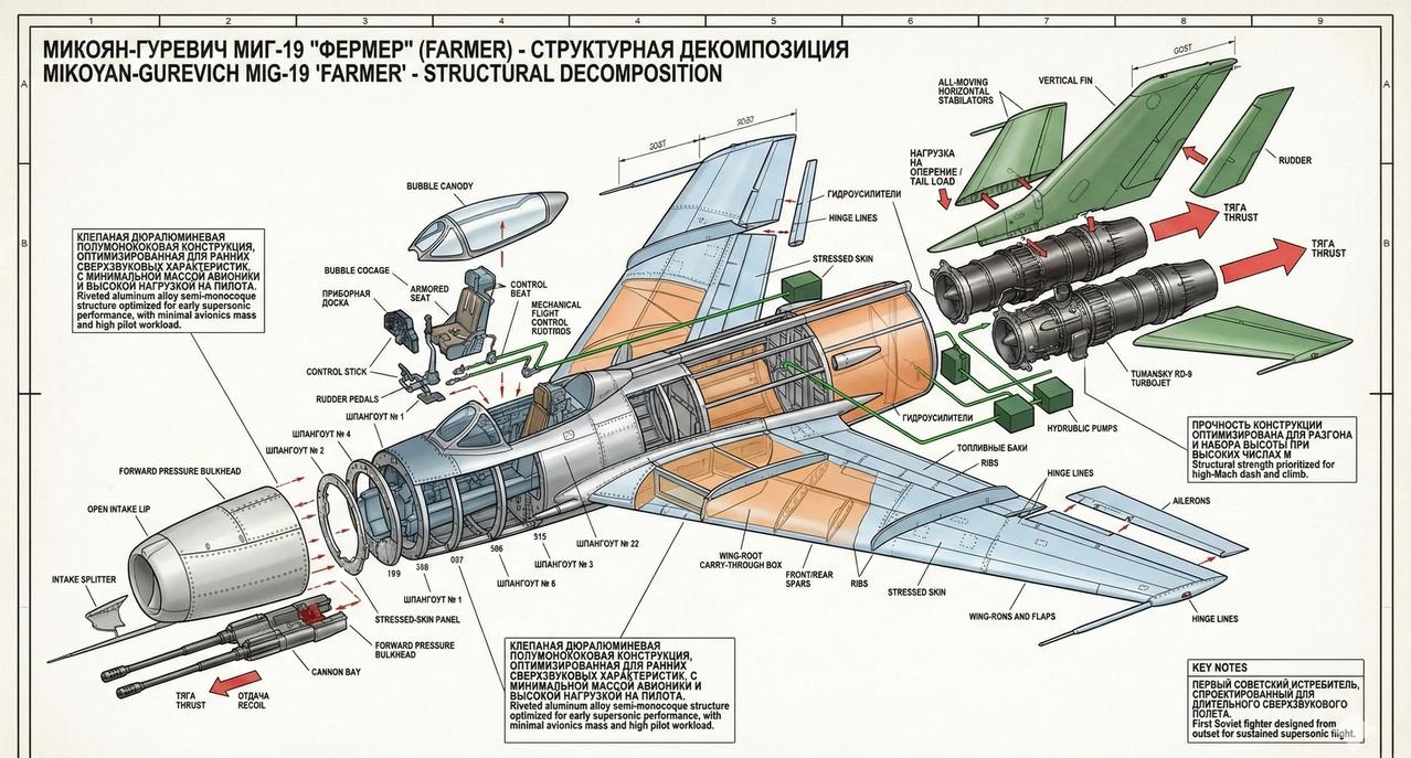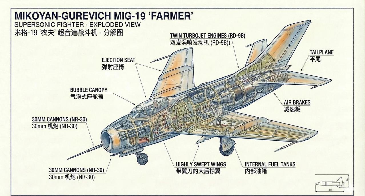 Mig-19: 苏联超音速时代的“垫脚石” 米格-19(MiG-19,“农夫”)是苏联第一种从设计之初就以持续超音速飞行为目标的量产战斗机,标志着苏联战斗机由跨音速时代正式迈入超音速时代。其采用双台 RD-9 涡喷发动机,通过“以推力换速度”的思路解决早期气动与控制技术不足的问题,体现了50年代苏联以动力驱动突破技术瓶颈的工程路径。 在结构上,米格-19延续了金属半硬壳体结构与高度密集的机身框架,机体空间大量让位于进气道与发动机,航程与作战半径有限,飞行操纵依赖机械-液压系统,飞行员工作负担较高,超音速状态下稳定性与可控性要求严格。 在历史作用上,米格-19并非成熟的“终极型号”,而是一次关键的工程过渡机型:它为苏联积累了超音速进气、结构强度、热环境与操纵特性等宝贵经验,直接促成了以效率和简化著称的米格-21诞生。米格-19的意义不在于长期服役表现,而在于它完成了苏联战斗机迈入超音速时代最艰难的一步。 战斗机 航空 武器装备 米格19 米格 米格21 mig 航空航天 超音速 军事 飞机模型 模拟飞行