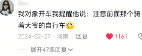 我对象开车我提醒他说:注意前面那个骑着大爷的自行车