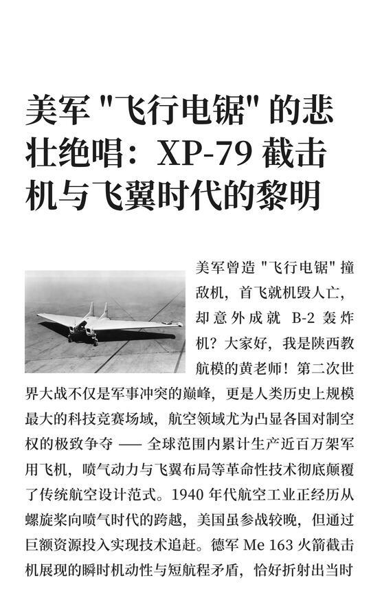 美军 "飞行电锯" 的悲壮绝唱:XP-79 截击机 XP-79是二战期间美国研发的飞翼截击机,设计初衷是高速撞击敌机,但首飞即因失控坠毁,飞行员牺牲。尽管失败,其气动数据为后续飞翼设计奠定基础,最终在B-2隐身轰炸机中得以延续。航模黄老师 一起看飞机 航空航天 战斗机 武器装备 军事