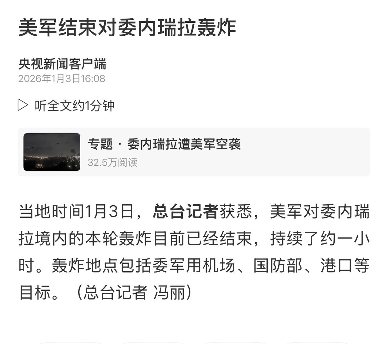 当地时间1月3日凌晨,美国对委内瑞拉首都发动空袭。委内瑞拉总统马杜罗随即宣布全国进入紧急状态,并抗议此为“军事侵略”,指控美国意在夺取其石油与矿产资源。委政府已呼吁国内各方力量启动动员计划。