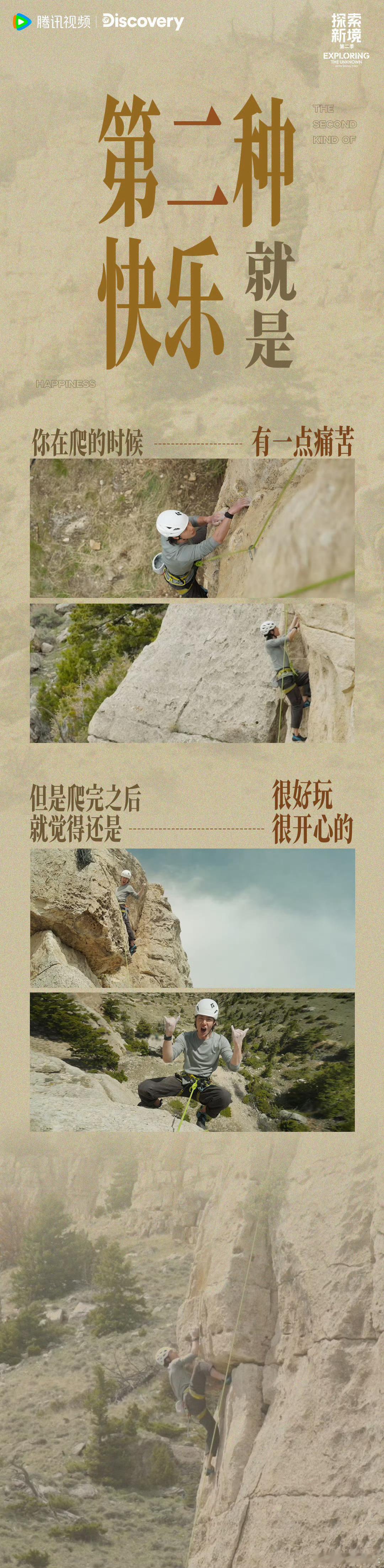王一博的第三种快乐原来是这样的 《探索新境》今天这期,探索“心境”,探索自我,活出生命的极致,感受极限的快乐。第一种快乐你在爬的时候也很快乐 爬完也很快乐第二种快乐你在爬的时候有一点痛苦 但是爬完之后就觉得还是很好玩 很开心的第三种快乐做起来不快乐,做完之后也不快乐但是过了一段时间的沉淀回想起来是一种快乐吧王一博