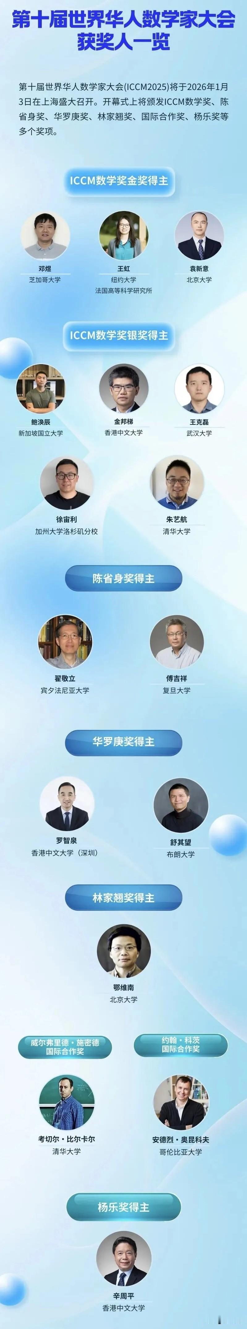 第十届世界华人数学家大会ICCM数学奖金奖的三位得主分别是邓煜、王虹、袁新意,三人皆是国际数学界的顶尖青年学者,各自在不同领域取得了里程碑式突破。 ICCM数学奖(45岁以下青年力量)金奖 得主均为新一代华人数学家代表,王虹更是破解了数学界百年难题“三维挂谷猜想”。 首次增设华罗庚奖和林家翘奖,与陈省身奖共同构成表彰45岁以上华人数学家的三大核心奖项